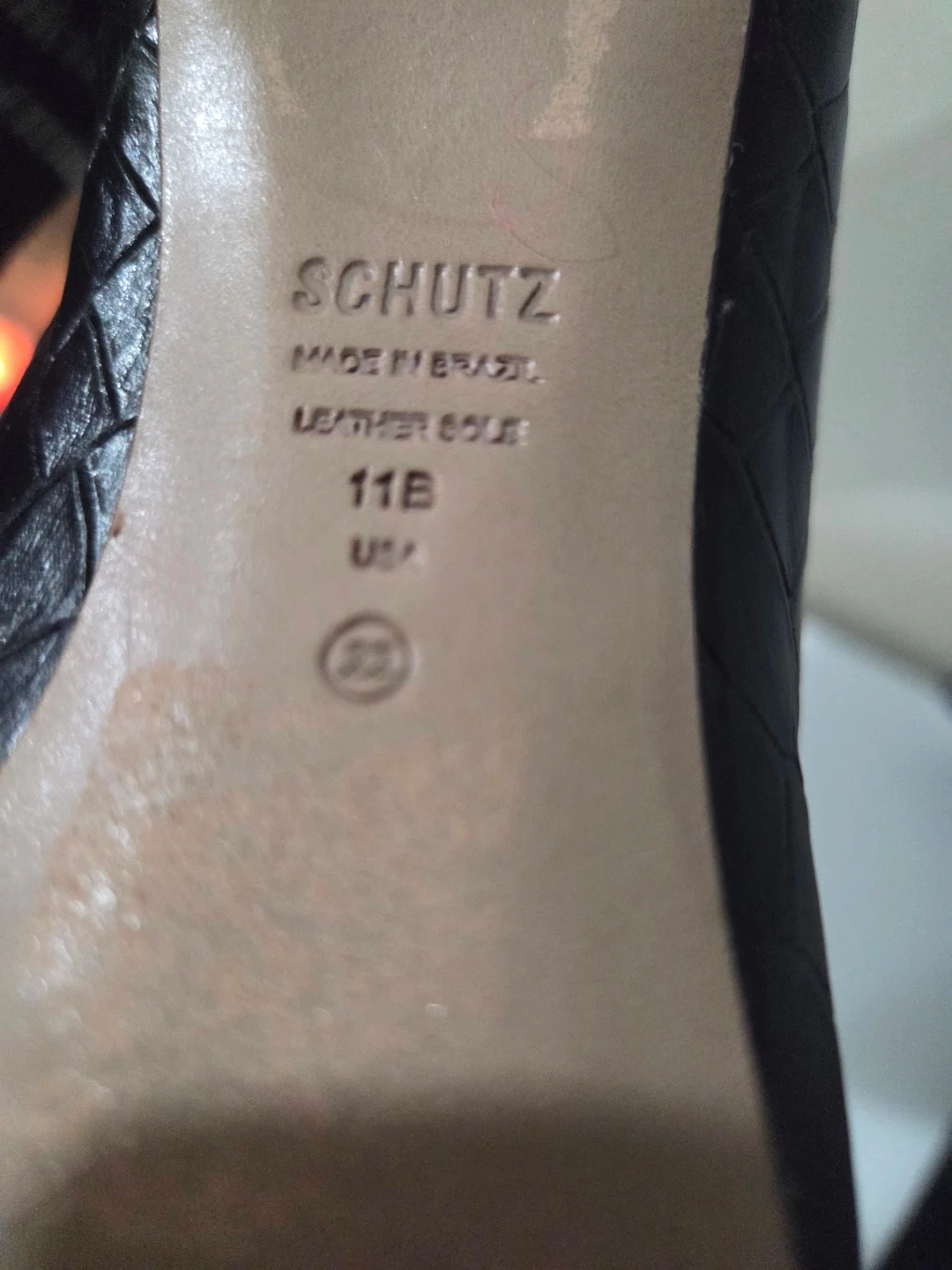 These are Schutz black embossed leather heeled boots. They feature a pointed toe and a stiletto heel. Made in Brazil with a leather sole.