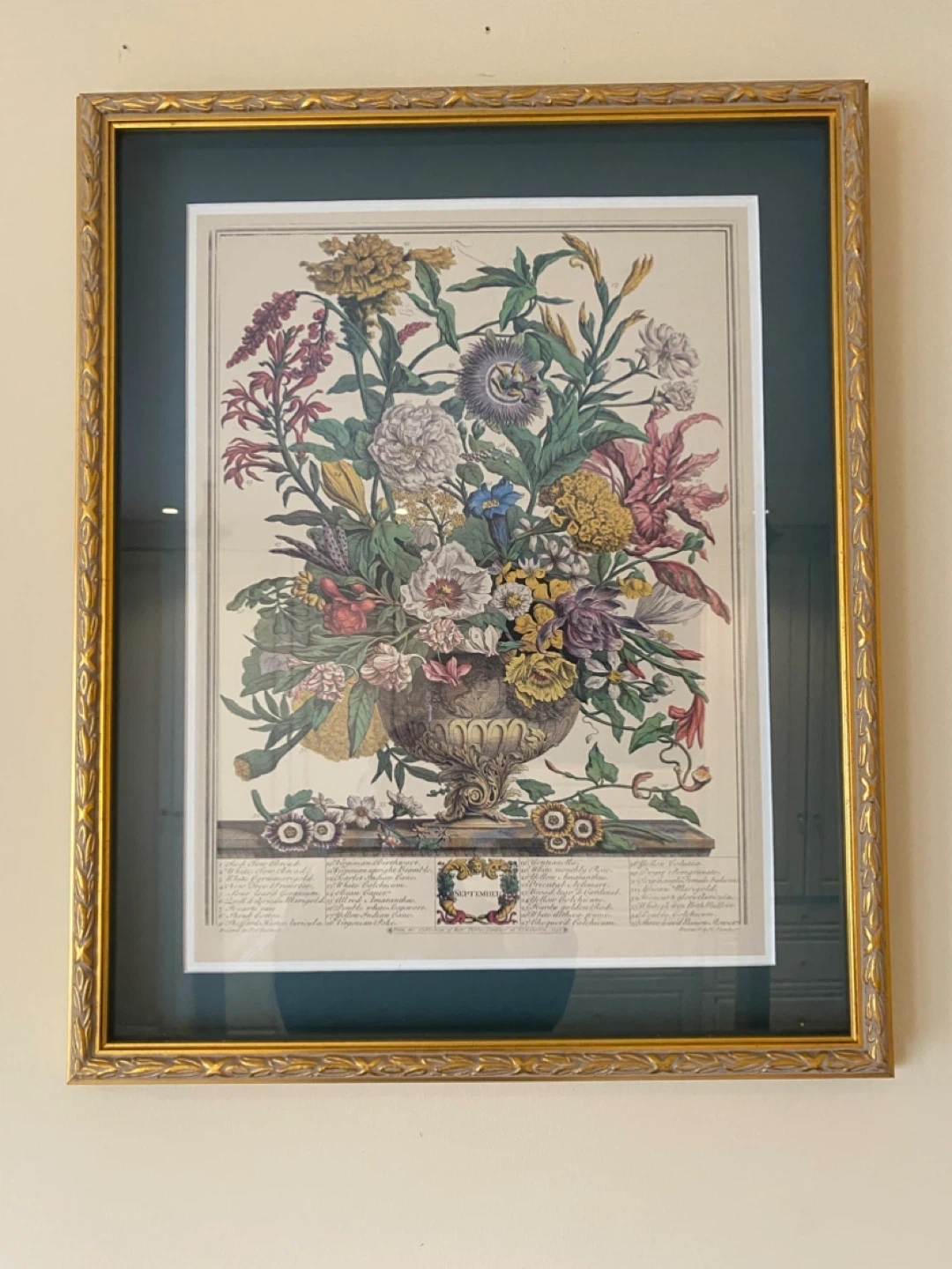 A beautiful framed print depicting a floral arrangement for September. The print features a detailed illustration of various flowers in an urn. Includes informative text below the illustration. Measures approximately 18x24 inches including the frame.