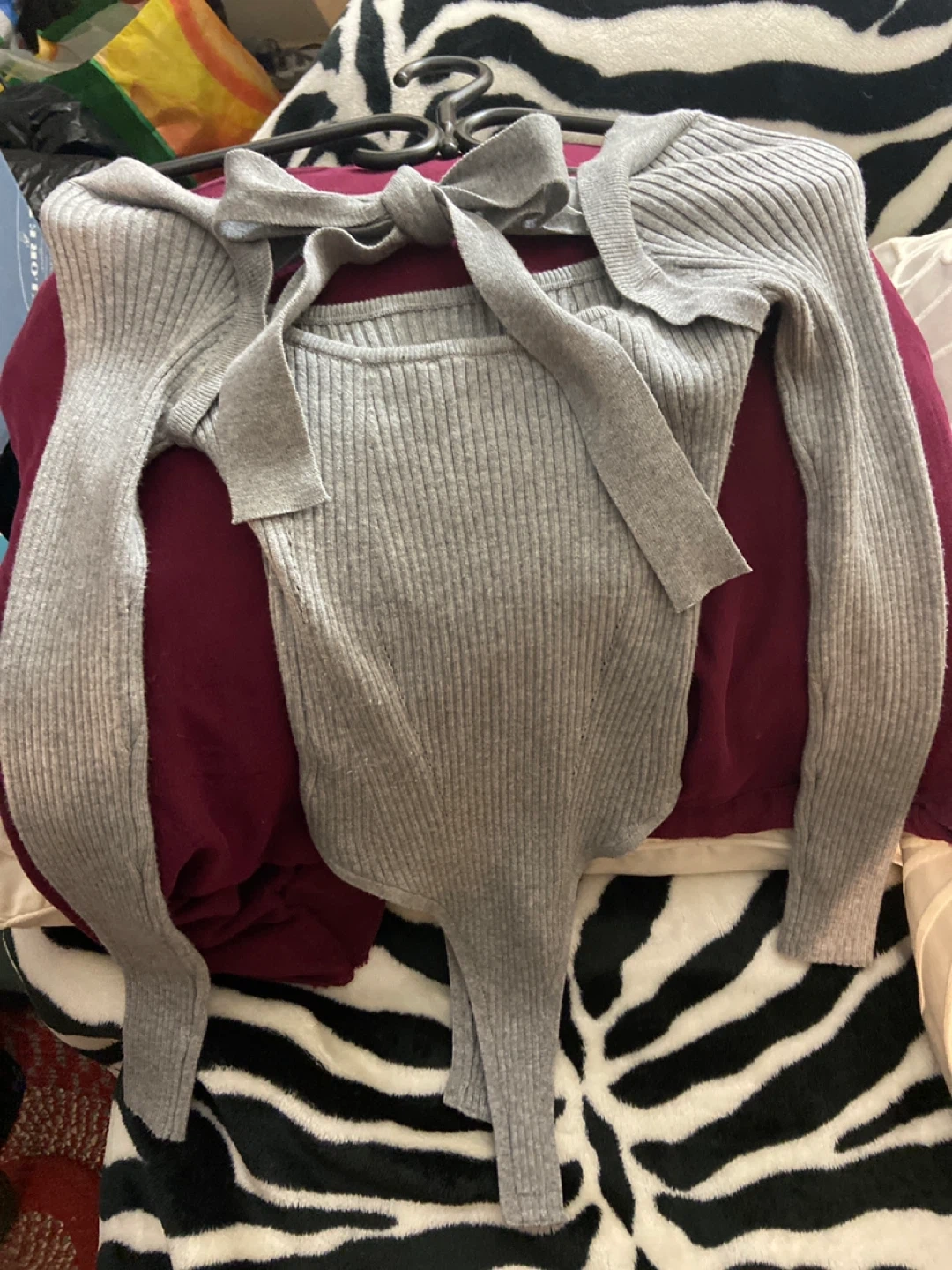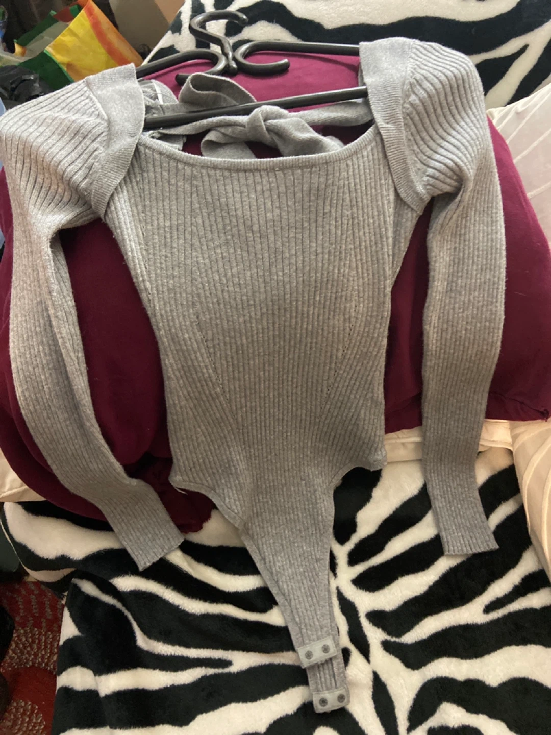 This grey ribbed long sleeve bodysuit features a flattering fit with a stylish tie-neck detail. It's made from a comfortable knit material. Snap closure at the bottom.