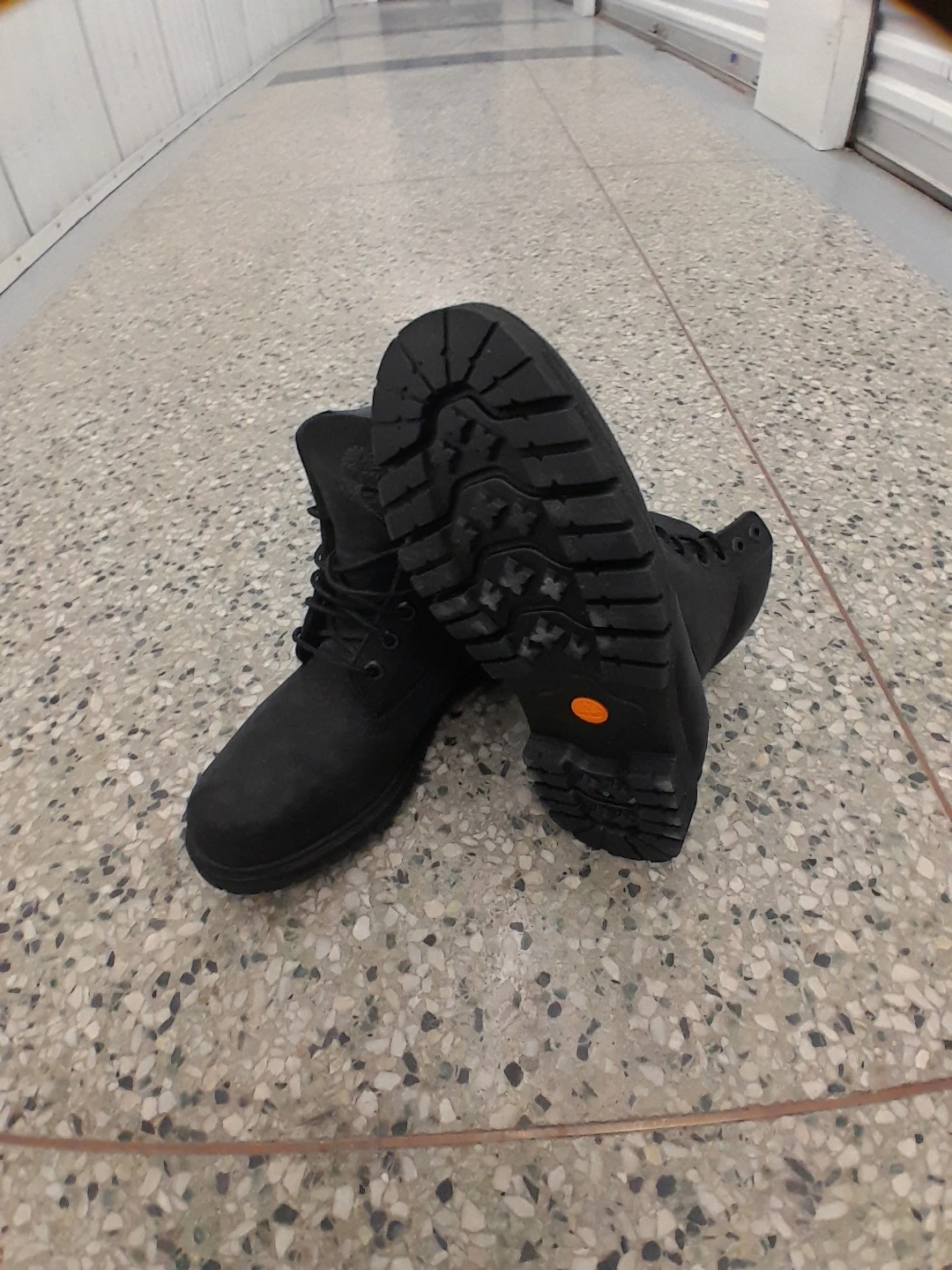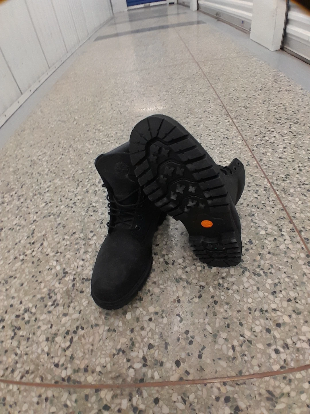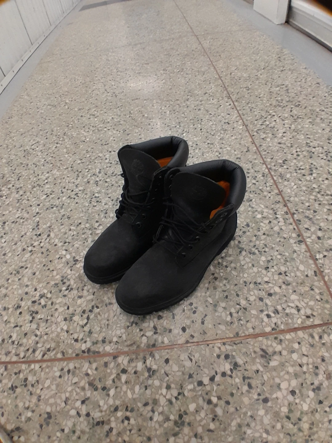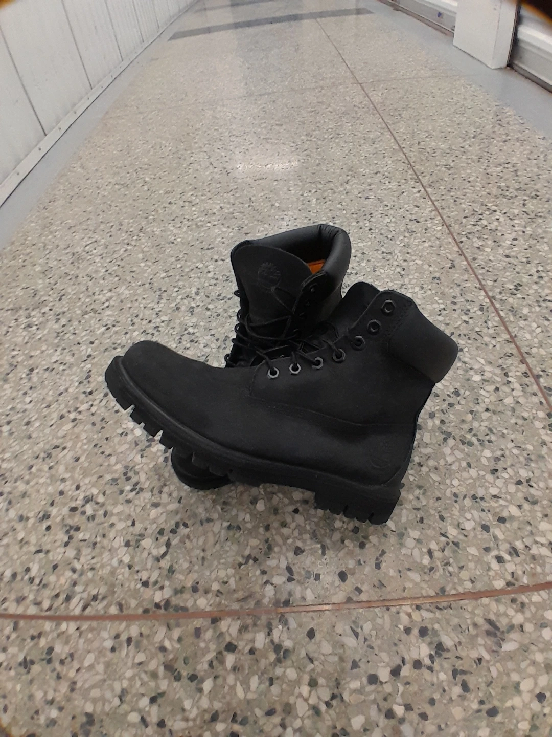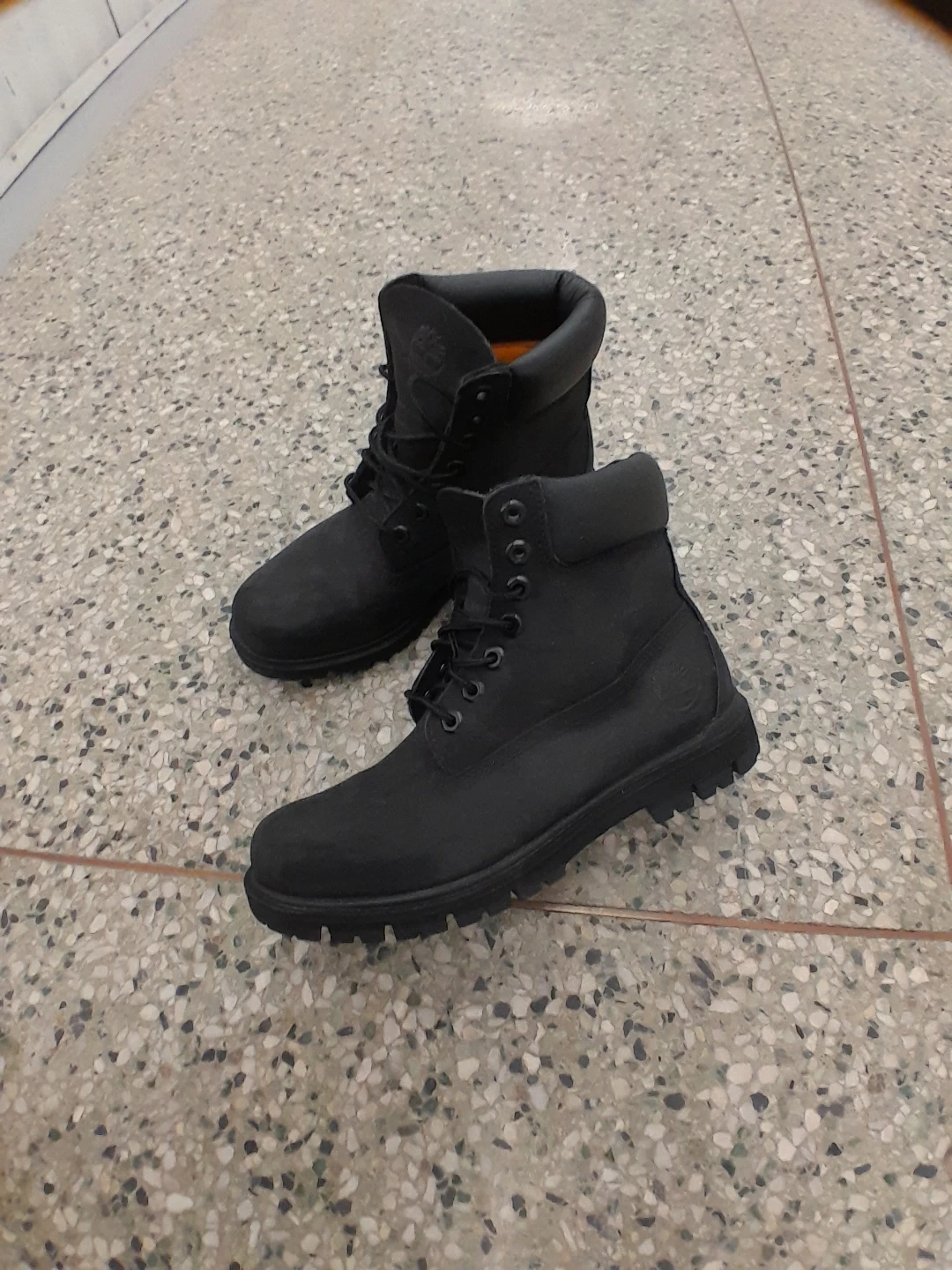 Classic black Timberland lace-up boots. Durable construction with a thick tread sole for traction. These boots are a staple for any season men's size 8
