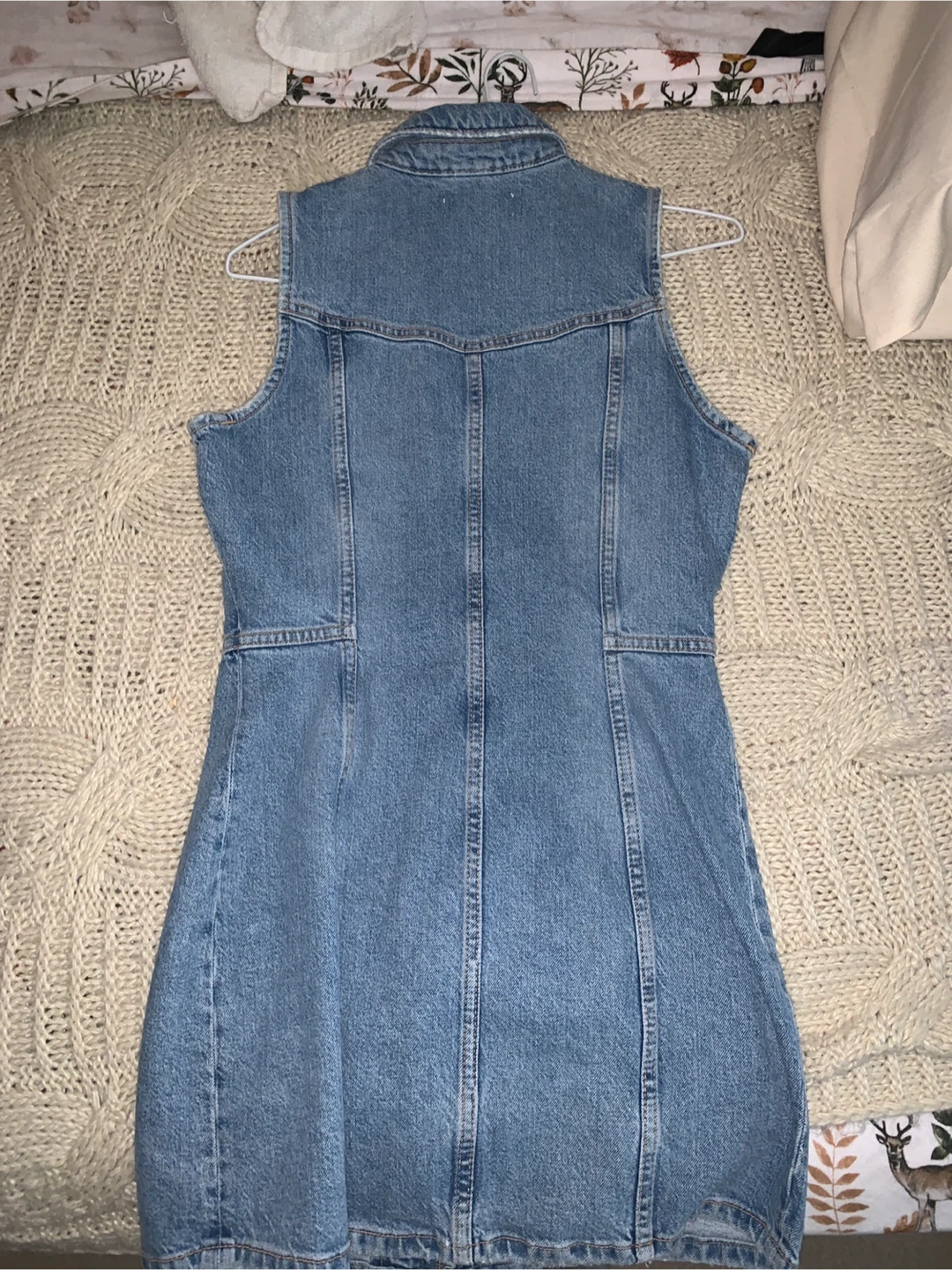 ZARA sleeveless denim dress with a front zipper closure. It's made of durable denim material and features two chest pockets. Size M, which is equivalent to US 28. This versatile dress is perfect for a casual day out!