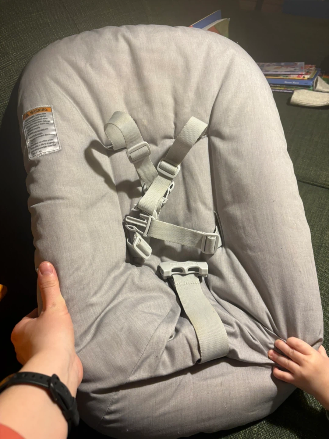 This is a soft grey baby lounger with a 5-point harness system. It's made of a comfortable fabric material. This lounger is suitable for infants.
