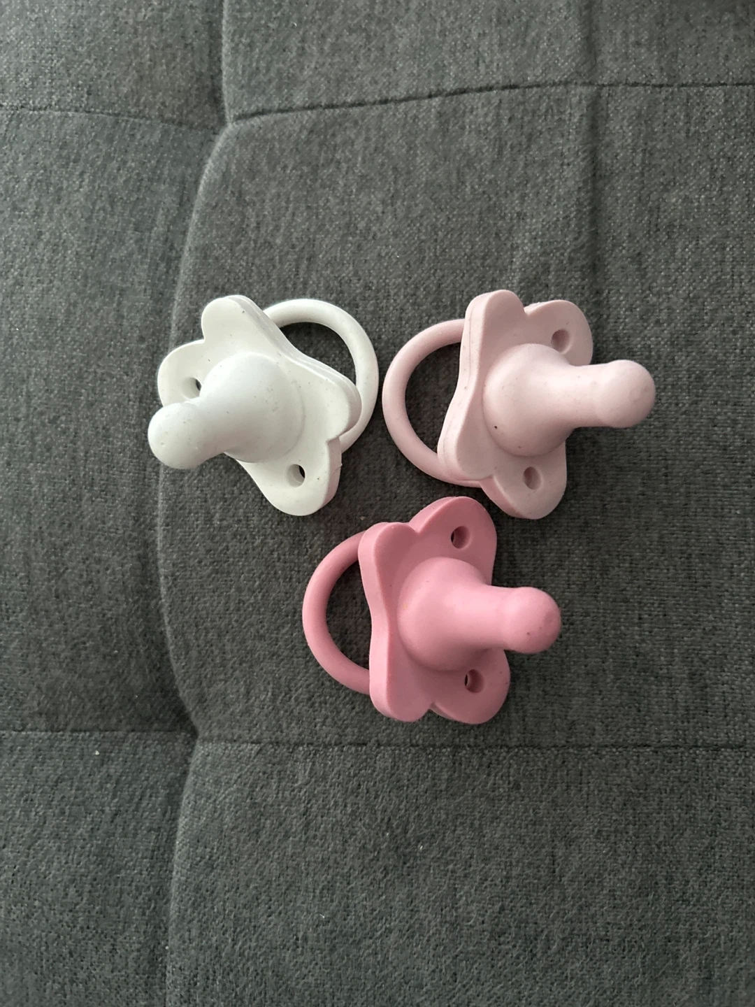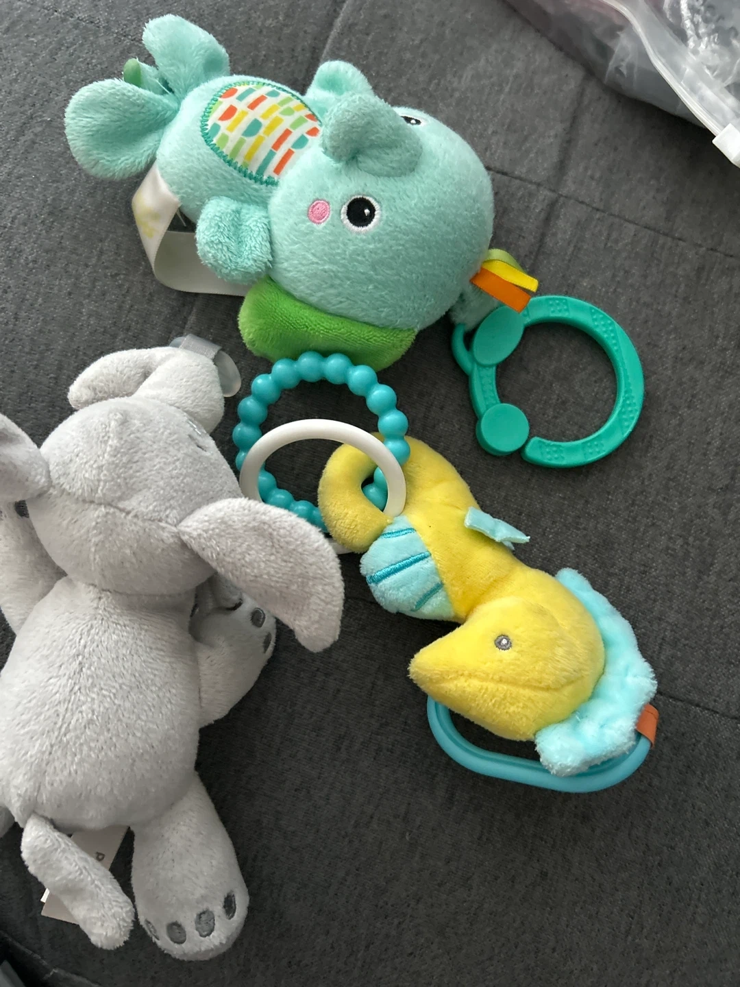This lot includes several baby toys, such as a Bright Starts plush elephant, a seahorse rattle, and three pacifiers in white, pink, and rose. The elephant has a soft plush exterior and plays music. The pacifiers are made of silicone.