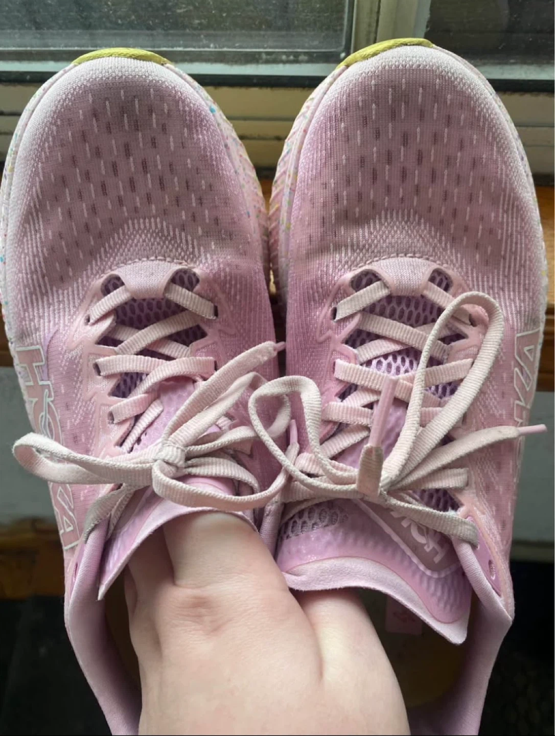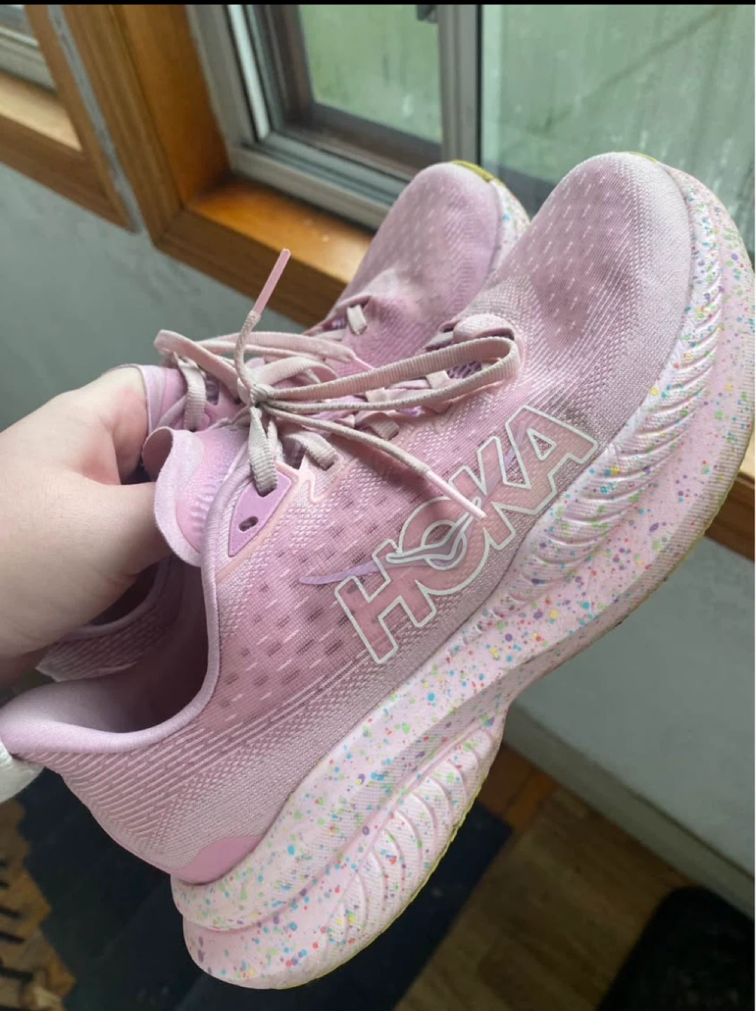 These are pink Hoka running shoes. They have a speckled midsole and yellow soles. They're great for hitting the pavement!
