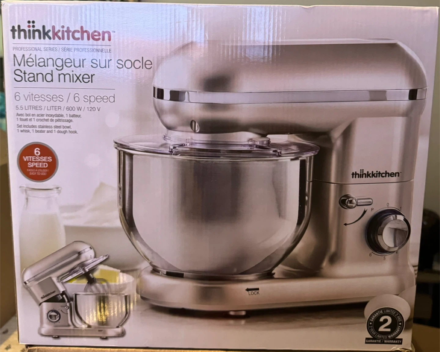 Selling a Thinkkitchen stand mixer! It has 6 speeds and a 5.5L capacity. The set includes a stainless steel bowl, whisk, beater, and dough hook. Brand new never been used.