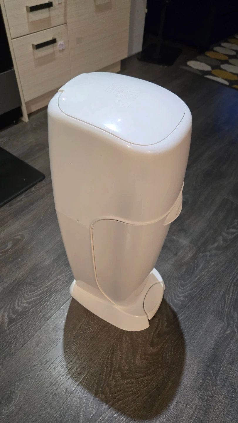 This is a white Playtex Diaper Genie Complete diaper pail. It features a foot pedal for hands-free operation. It's designed to help control odours and makes diaper disposal easy. Pickup at Yonge-Eglinton area. Cash only.