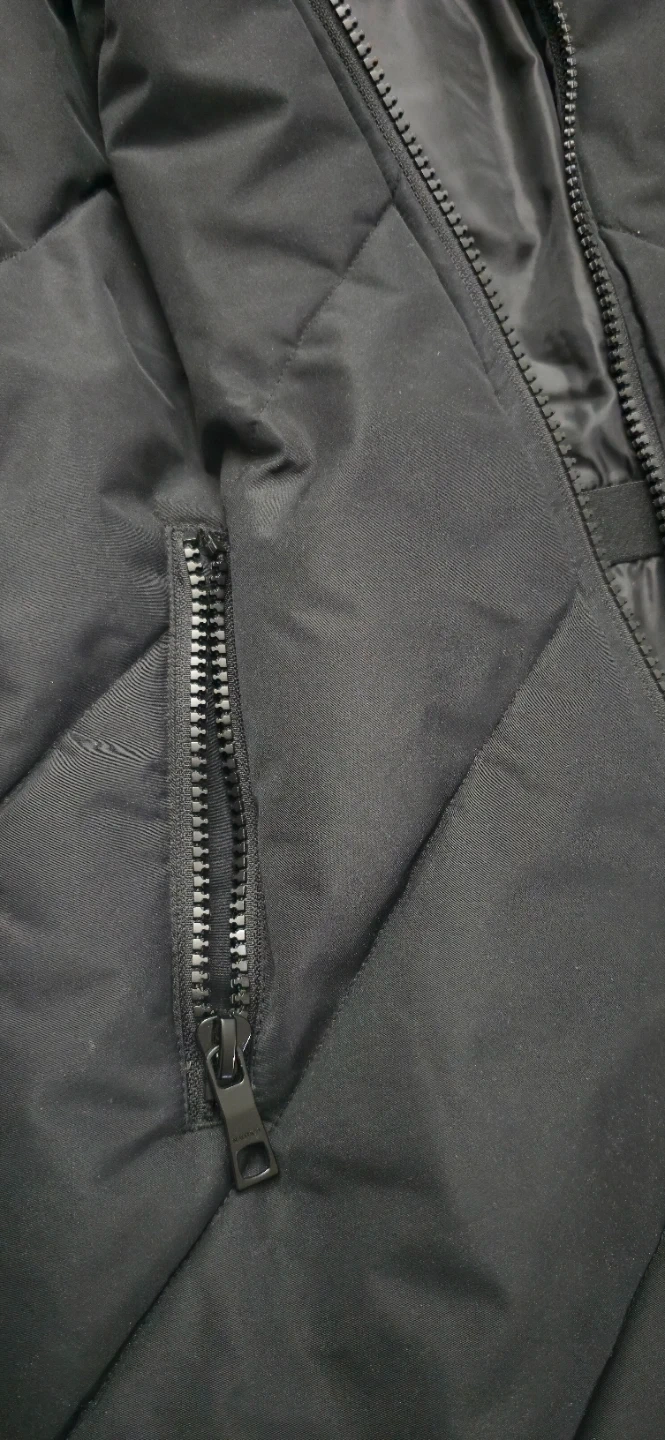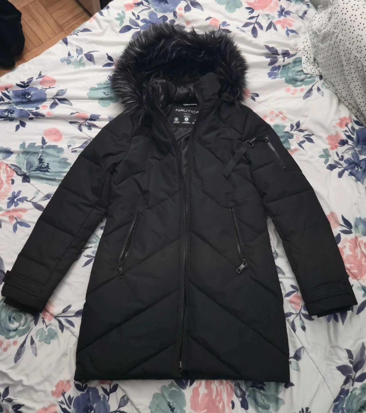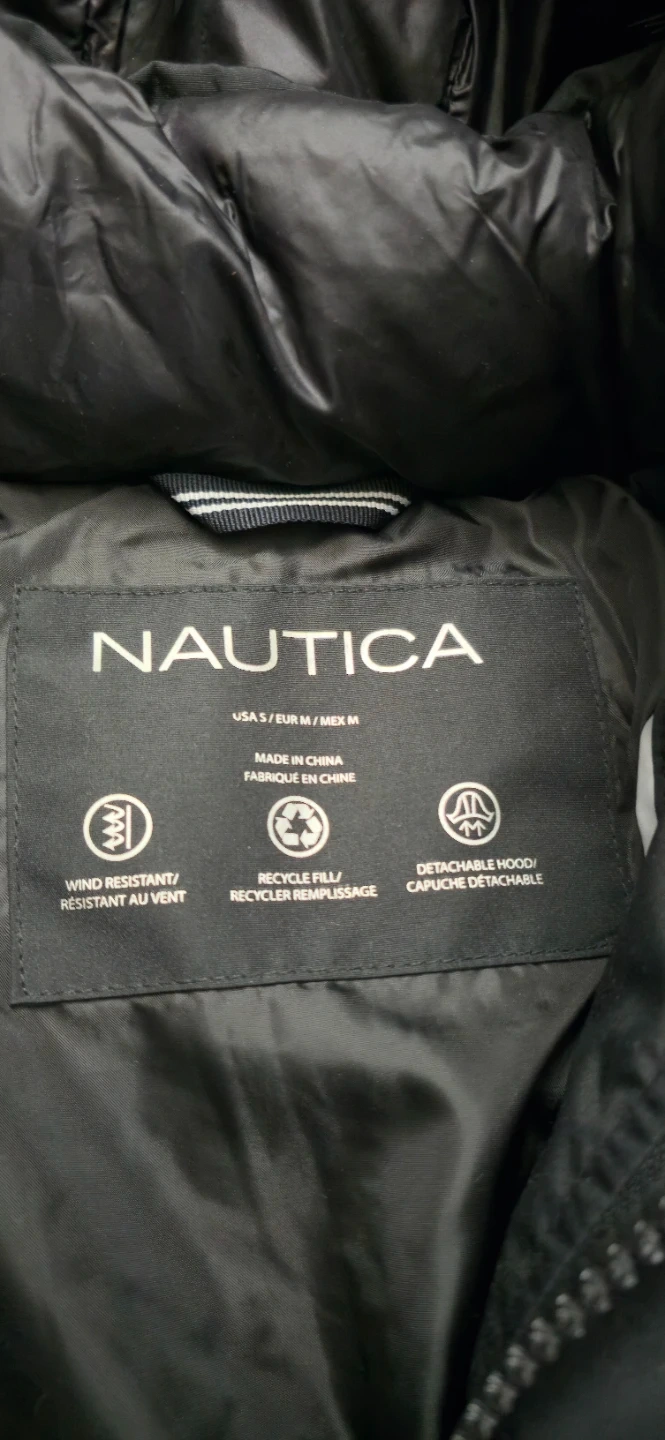 This Nautica puffer coat is black and features a detachable hood with faux fur trim. It's wind-resistant and made with recycled fill. The jacket has multiple zippered pockets.