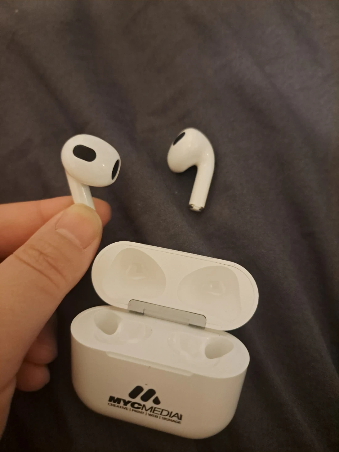 White wireless earbuds with a charging case featuring the MYCMEDIA logo. Includes earbuds and charging case.