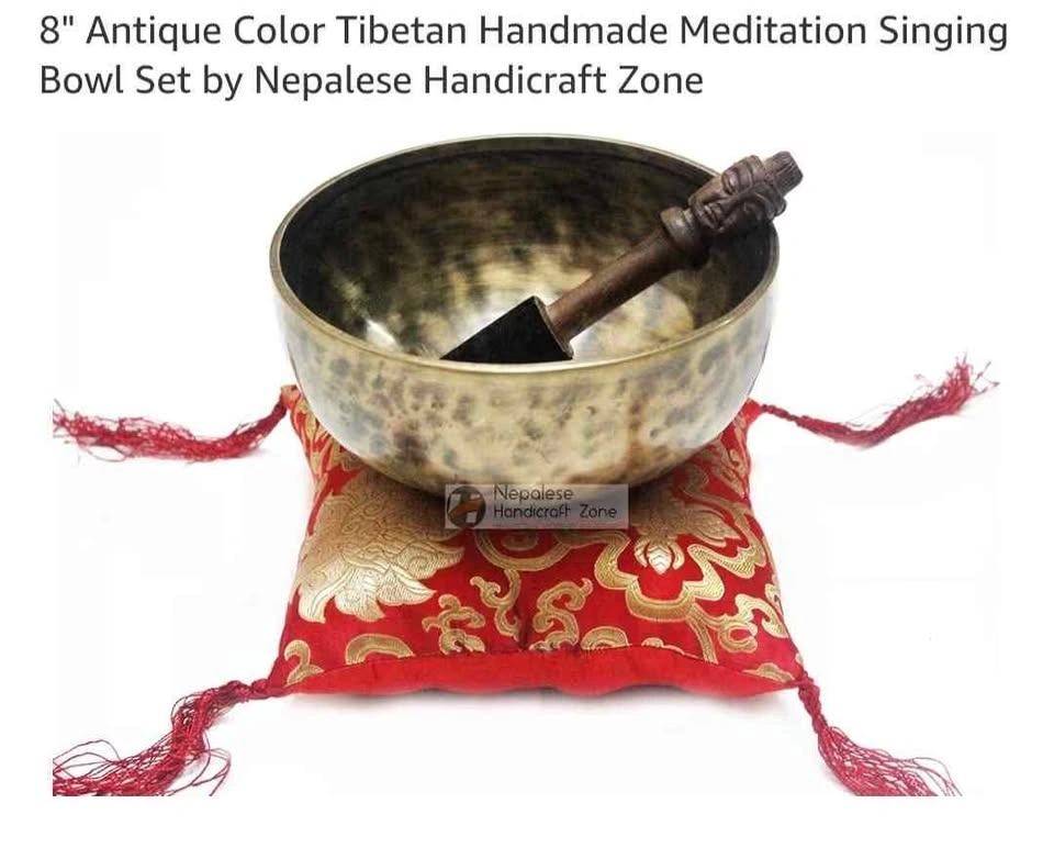 648" Antique Color Tibetan Handmade Meditation Singing Bowl Set by Nepalese Handicraft Zone Top highlights ColourAntique BrandNepalese Handicraft Zone MaterialBrass and 7 auspicious metals. Model nameNHZ Item dimensions L x W x H20.3 x 20.3 x 15.2 Centimetres Body materialBrass Tibetan High quality Singing Bowls (also known as Himalayan Bowls) are used for meditation, music, relaxation, sound massage, sound therapy, healing and personal well-being. Sound produced from sides and edge of the healing singing bowl by hitting or rubbing through striker are flows in our body, makes the mystical change in our body, thoughts, emotions and helps in chakra control. 7 metals are used on Yoga singing bowls: Iron, copper, zinc, brass, mercury, gold and silver,From the birth place of buddha 'Nepal' 8 inches hand hammered Himalayan bowl is a full set of meditation bowl, wooden striker and hand sewn cushion. This metal mindfulness prayer healing bowl made in the Himalayan Foothills By Nepalese artist to create an ambient for emotional calming & healing,Convenient to travel with Self pick up location Empress Walk and yonge street Cash only. I also have another 2 smaller singing bowl, please see my other listing.