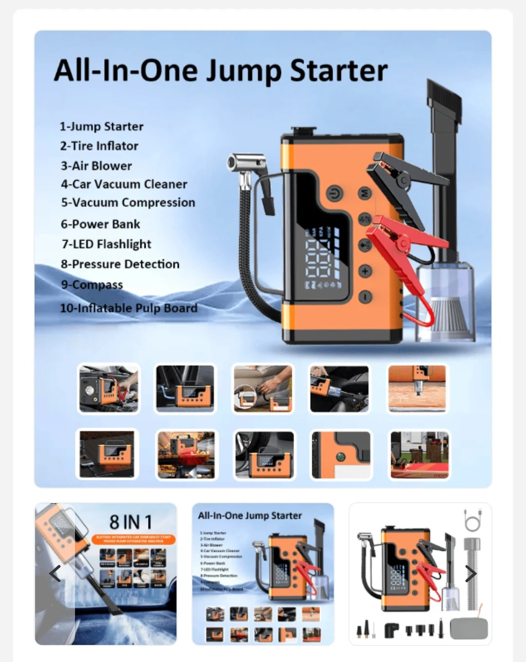 500Selling an 8-in-1 car emergency jump starter and power pump integrated machine. It features tire inflation, emergency activation, LED lighting, mobile charging, vacuum compression, TPMS, vacuum cleaner, and blower. It also functions as a jump starter, tire inflator, air blower, car vacuum cleaner, vacuum compression, power bank, LED flashlight, pressure detection, and compass. This item is very popular & practical to have with anytime especially with the winter coming. Stay safe & order 1 of these ๐๐ So far we have about 200+ approx before we're out of stock .