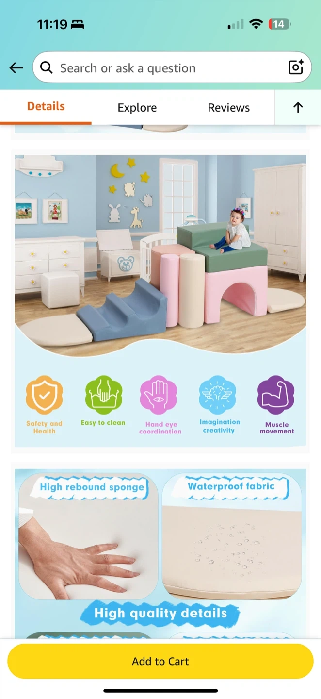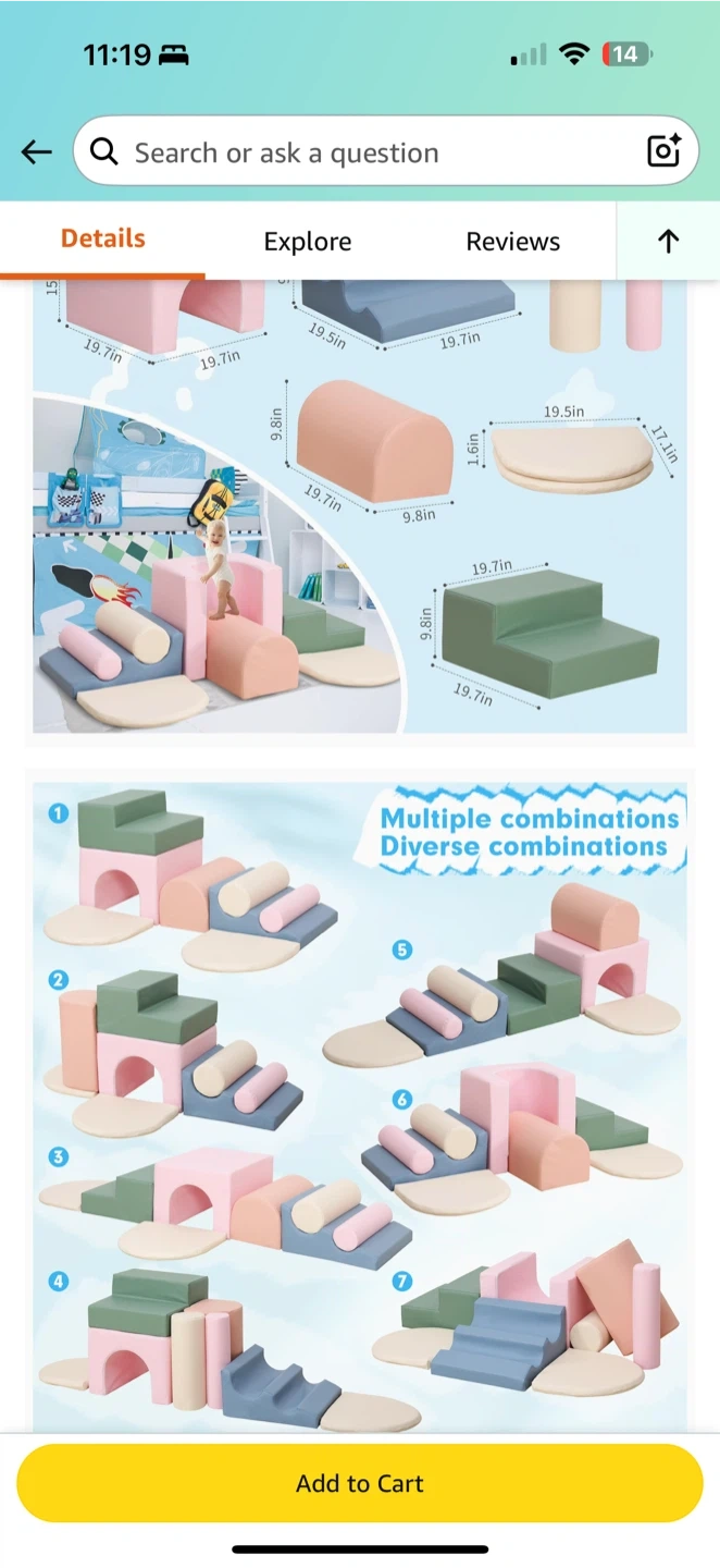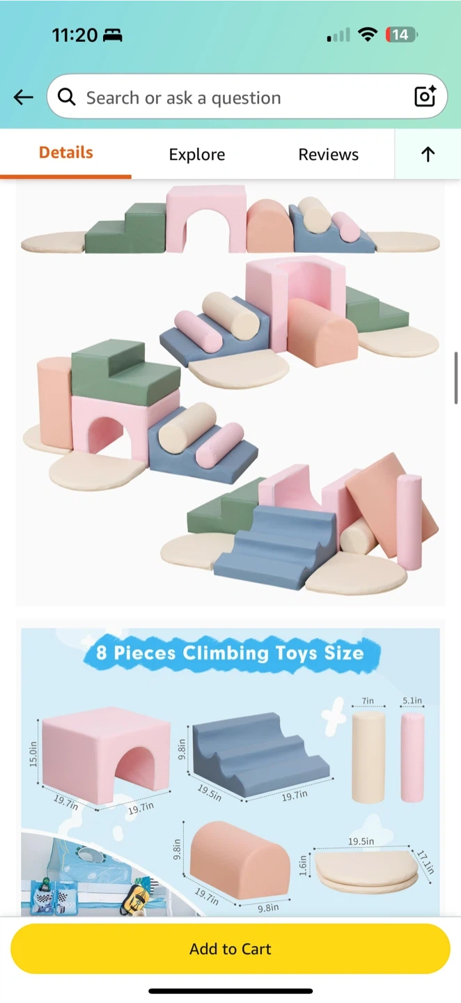 258-Piece Foam Climbing Blocks Set for Toddlers Condition: Brand new Colorful soft foam climbing and play set — perfect for toddlers (ages 1-3). Encourages creativity, coordination, and active play indoors. Can be arranged in multiple fun combinations! 📦 Includes 8 pieces: stairs, tunnel, arch, cylinder, ramps, and soft mats. 🎨 Color: Pastel “Lightweight” set (pink, blue, beige, green). 📏 Sizes: shown on photo — pieces approx. 19.7” × 19.5” × 9.8”. 🧽 Material: High-density foam with waterproof, easy-to-clean PU cover. ✨ Features: • Soft and safe for little ones 🤍 • Multiple configurations for endless play 🧩 • Helps develop balance and motor skills • Wipeable and lightweight 💲 Price: $160 🆕 Amazon price: $214.66 📍 Pickup in Waterloo