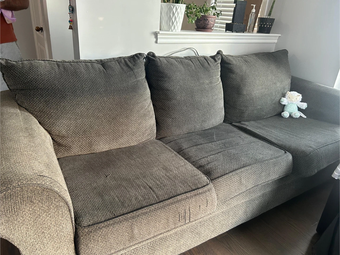 Moving out sale!!! Selling a comfy three-seat sofa! It's in good condition and perfect for a living room or den. The cushions are plush, and the neutral grey colour will fit in with any decor. It's a great spot to relax and watch a movie or read a book!