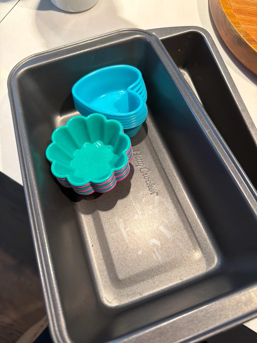 Selling a Betty Crocker loaf pan with some cute silicone molds! The molds are in heart and flower shapes and are teal and blue. The loaf pan is a standard size and in good condition for all your baking needs