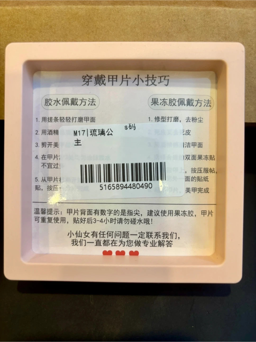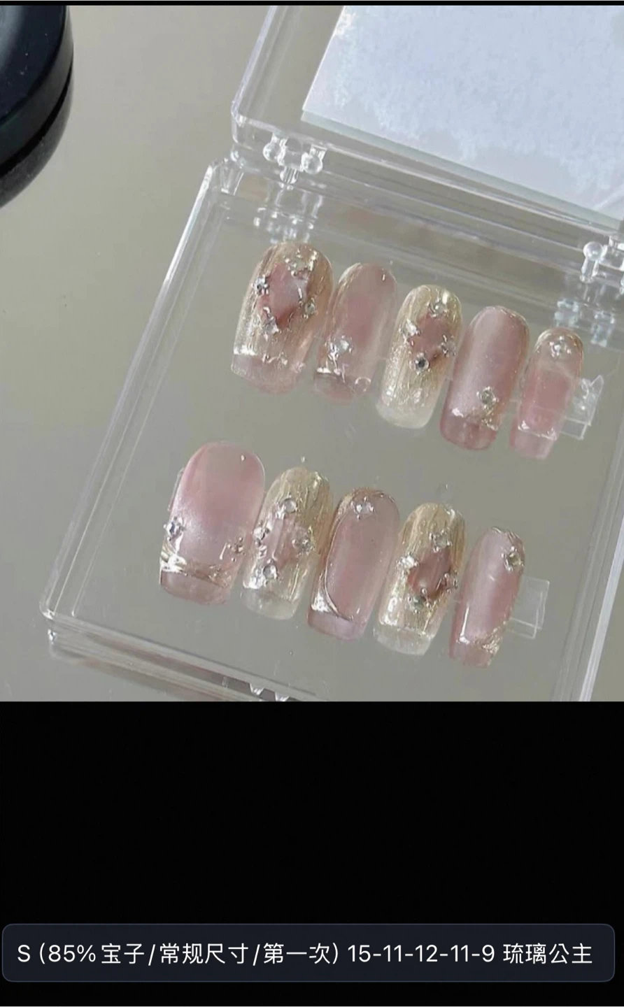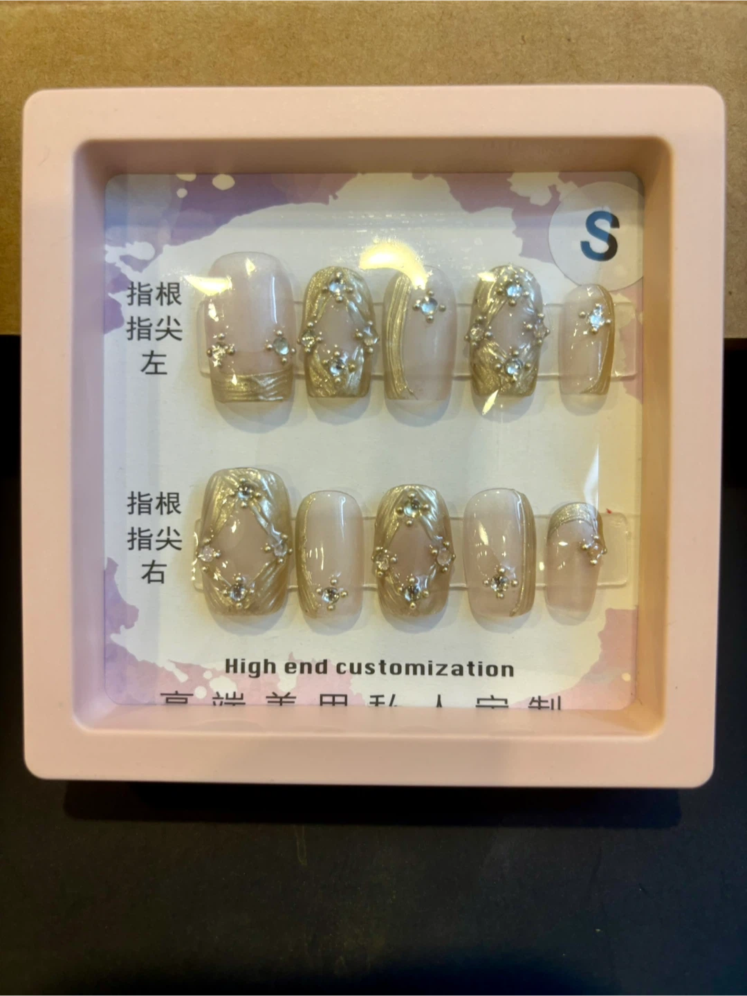 Selling a set of press-on nails in size S. These are high-end customized nails that are easy to apply with glue or gel. Includes an alcohol pad for disinfection use and other application tools. Perfect for a quick and stylish manicure!