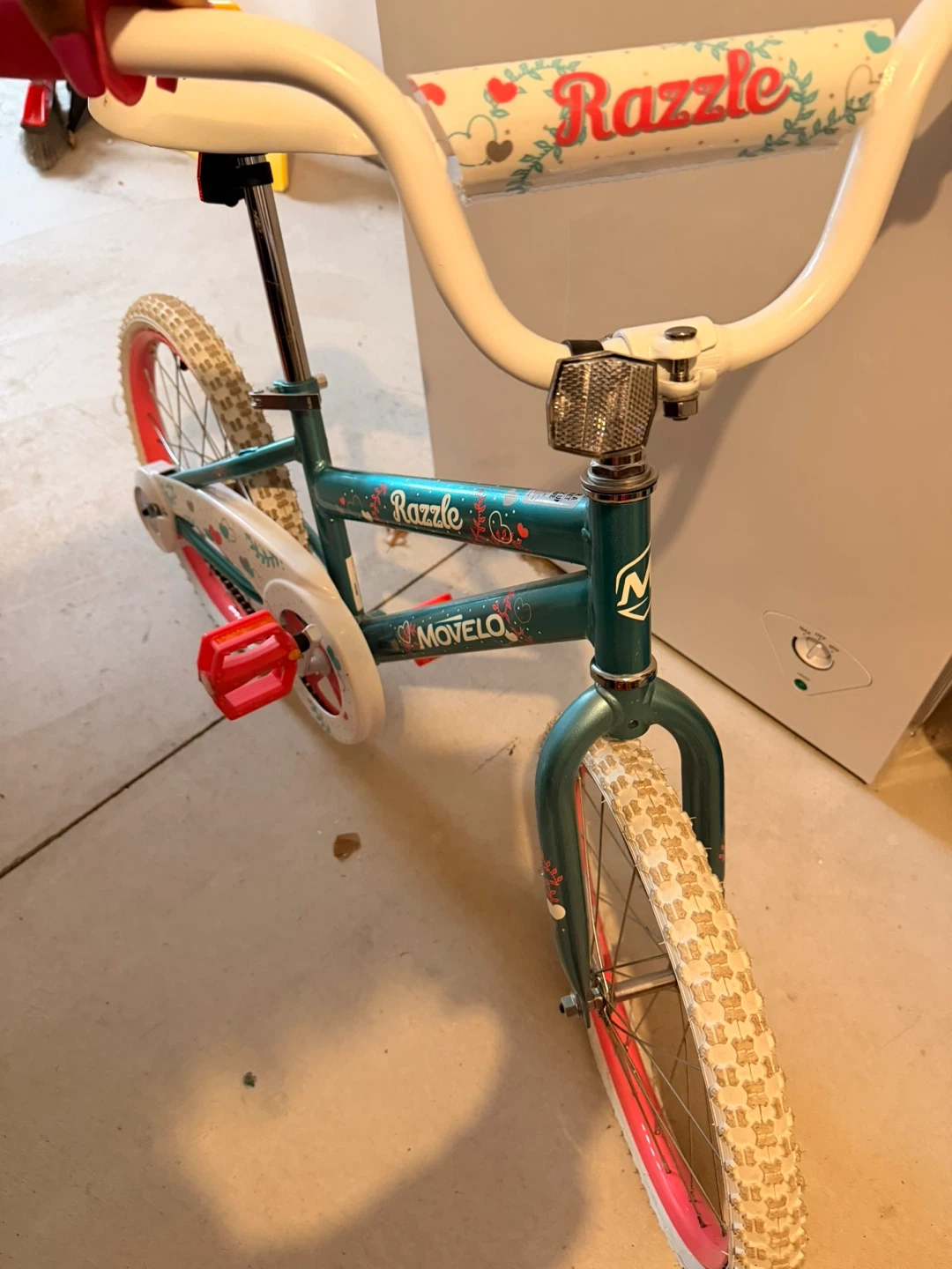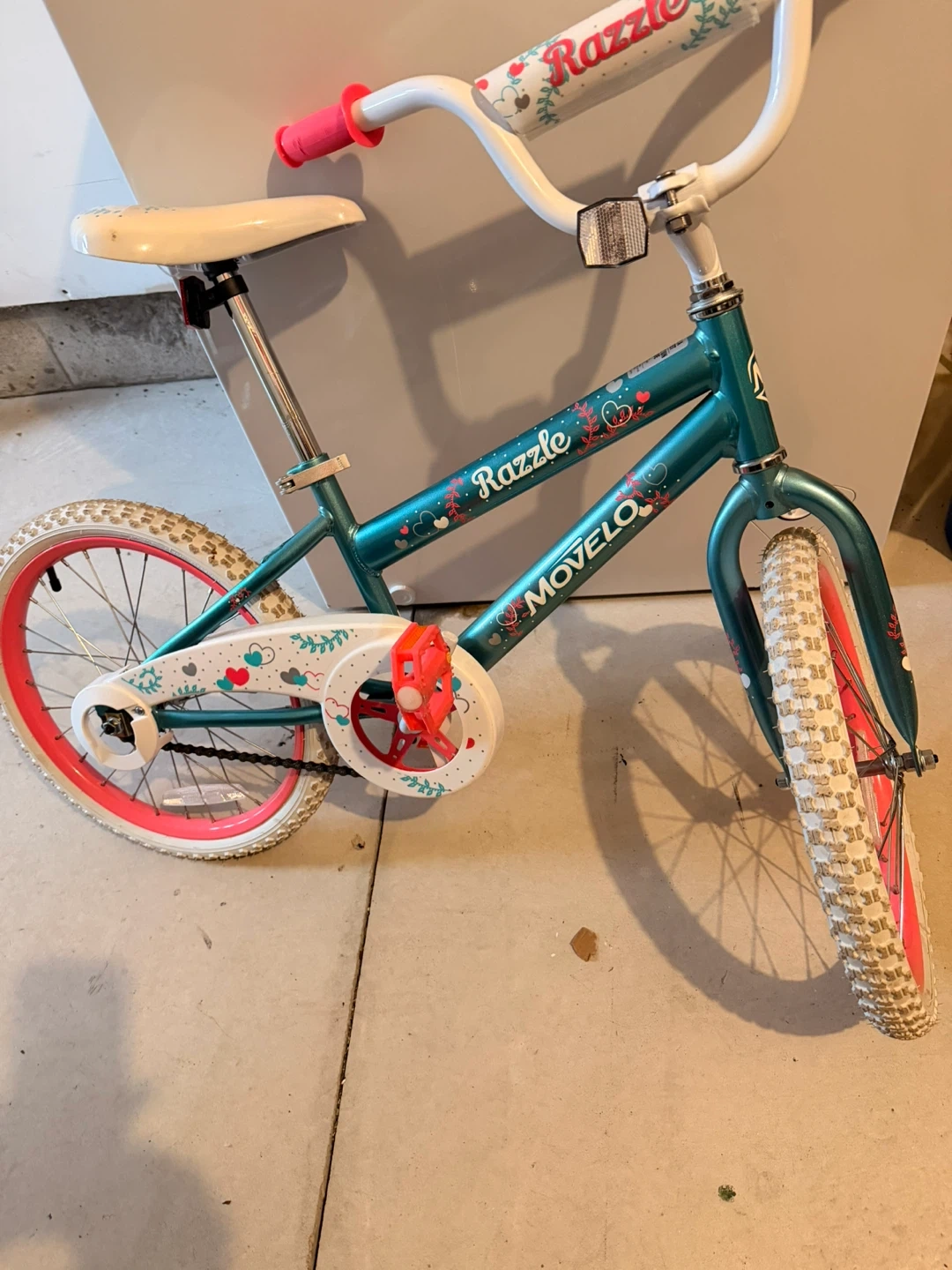Selling a Movelo Razzle kids bike in excellent condition! It's a super cute bike with a teal frame and pink accents. Perfect for a young cyclist looking for a fun ride