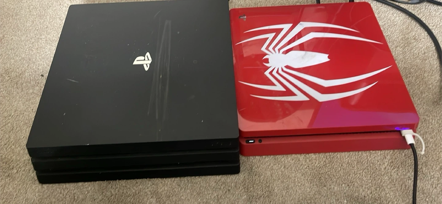 Selling a PlayStation 4 Pro, including a standard black console and a custom red Spider-Man edition console. Both are in used condition with some visible wear. Great for gamers looking for a fun setup!