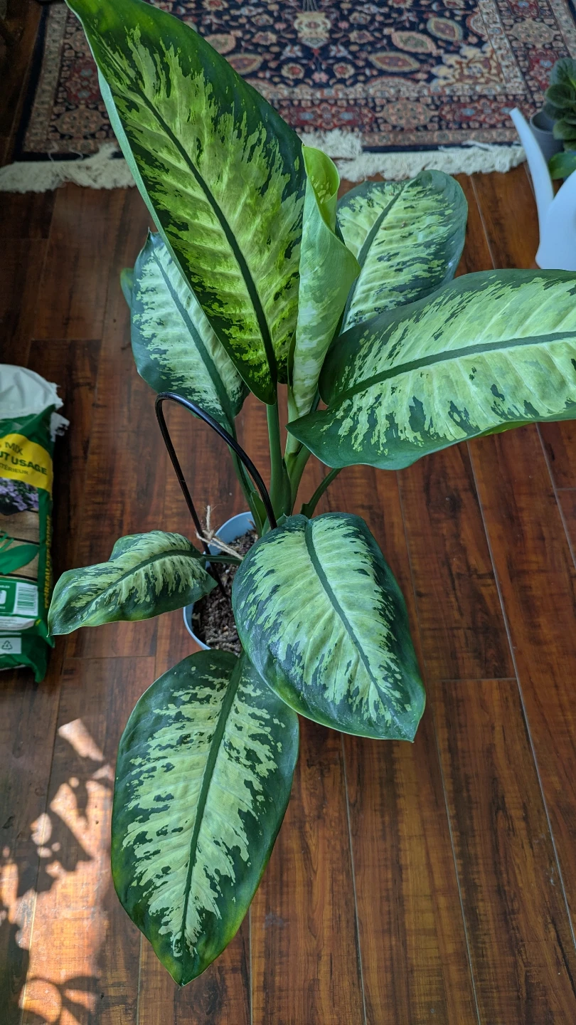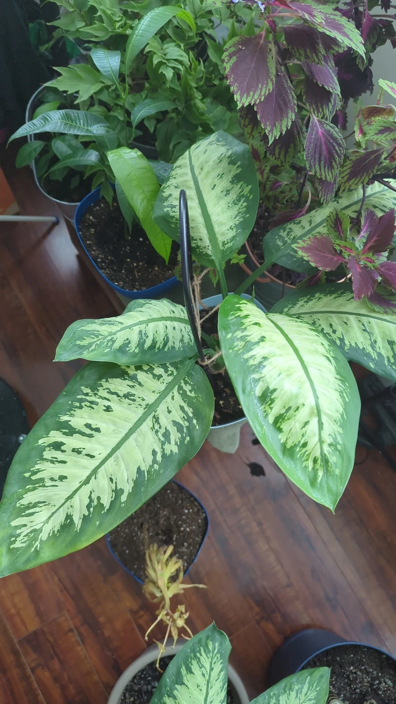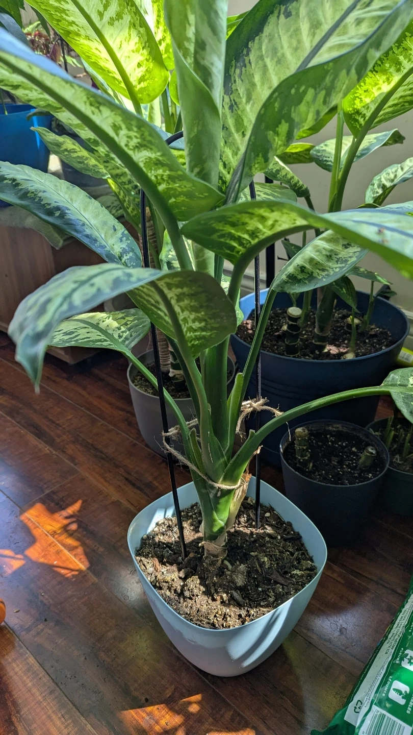 Selling a healthy Dieffenbachia plant potted in a light blue pot. It comes with a support structure to help it grow straight. Perfect for adding some greenery to your home!