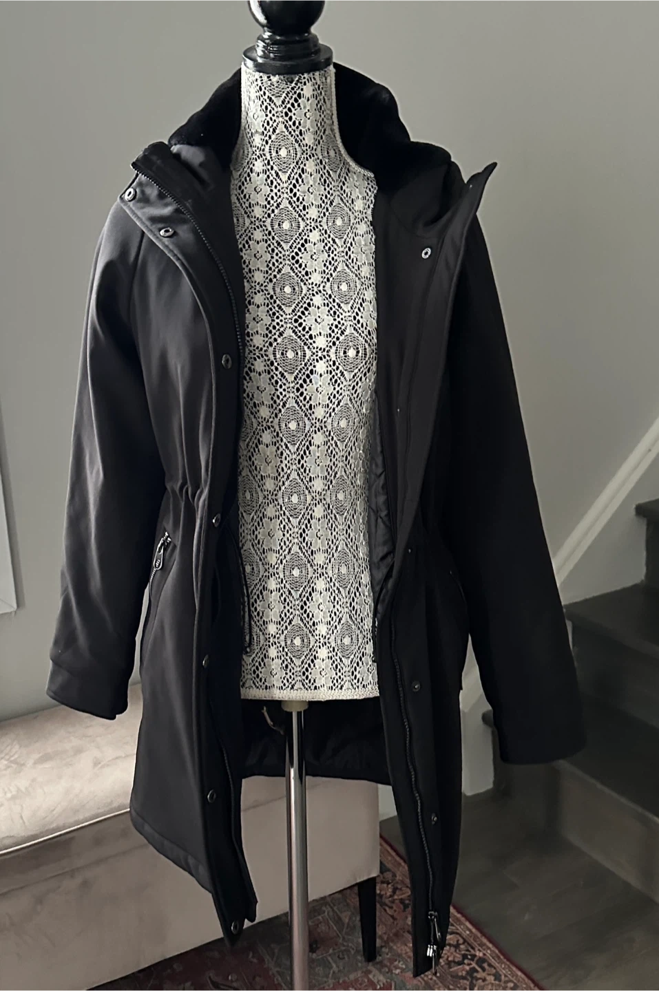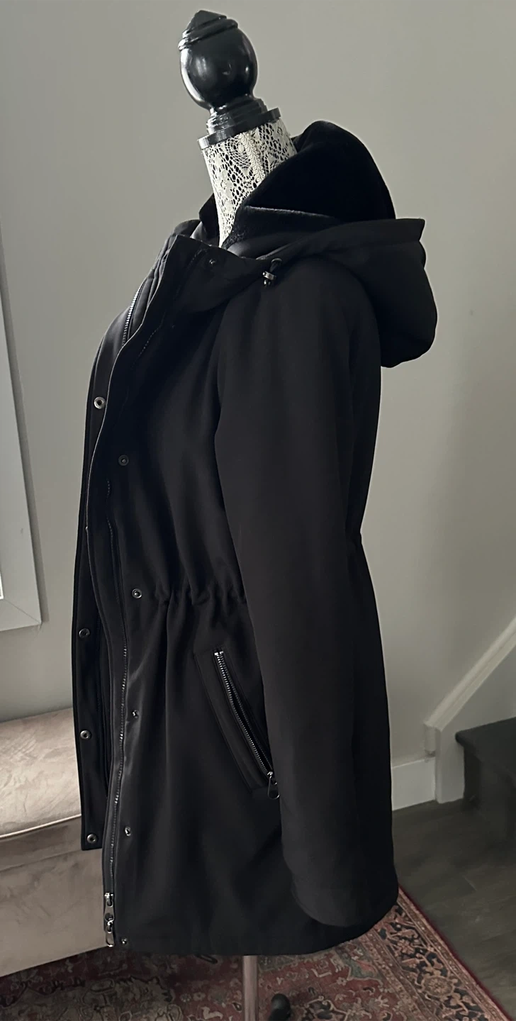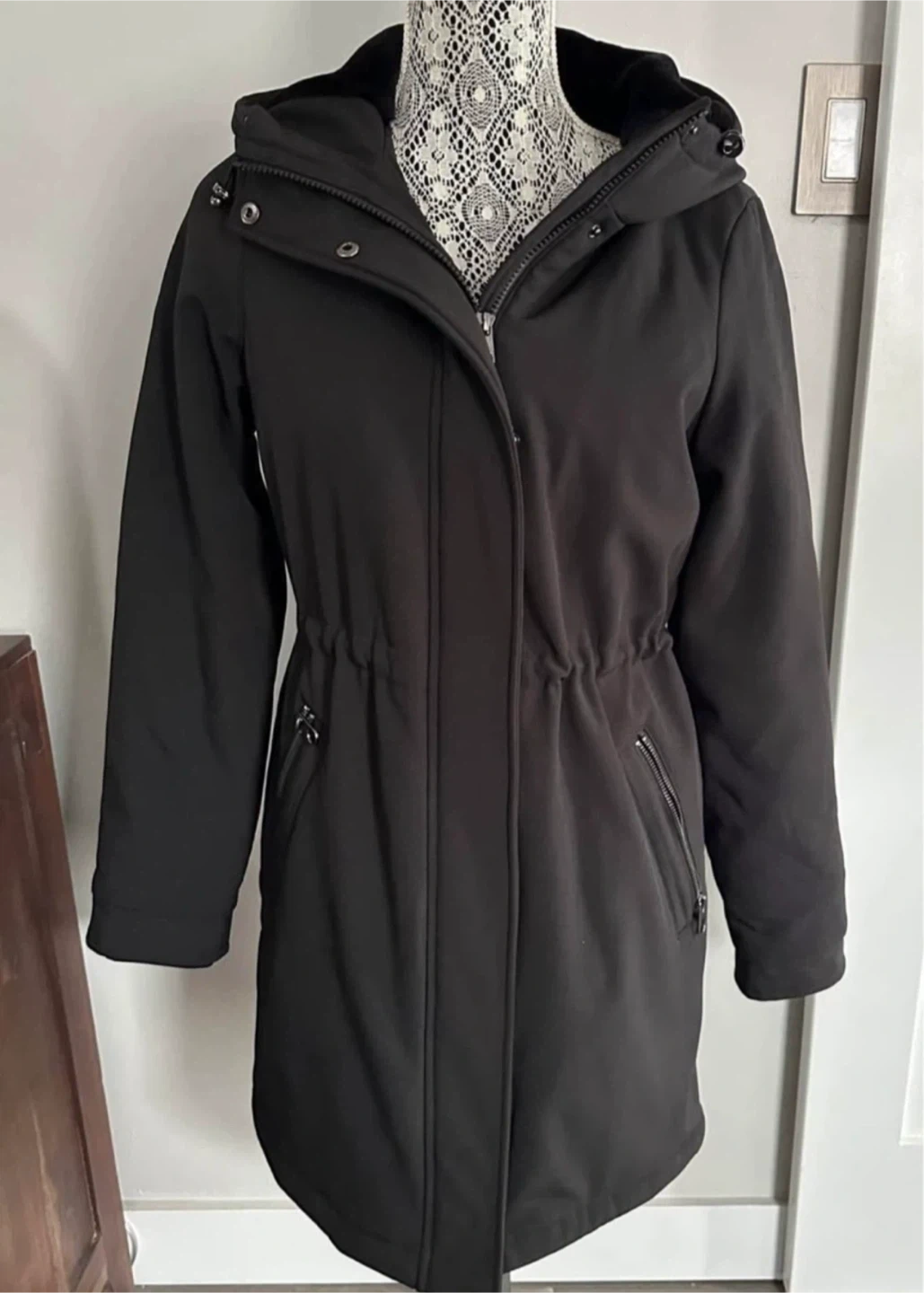 Selling a Vero Moda hooded coat in black. It's a size small and features a drawstring waist for a flattering fit. Perfect for those cooler days!
