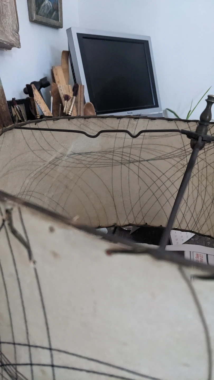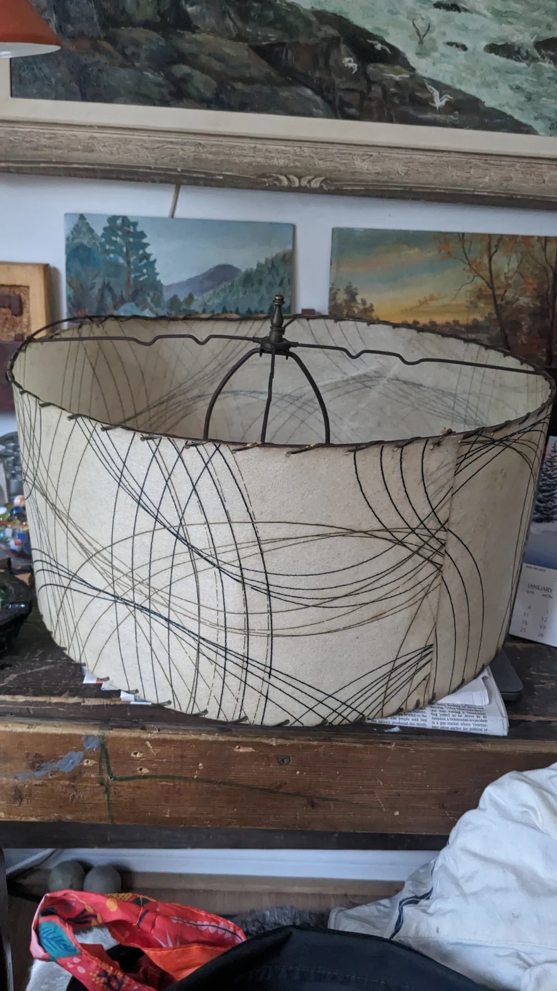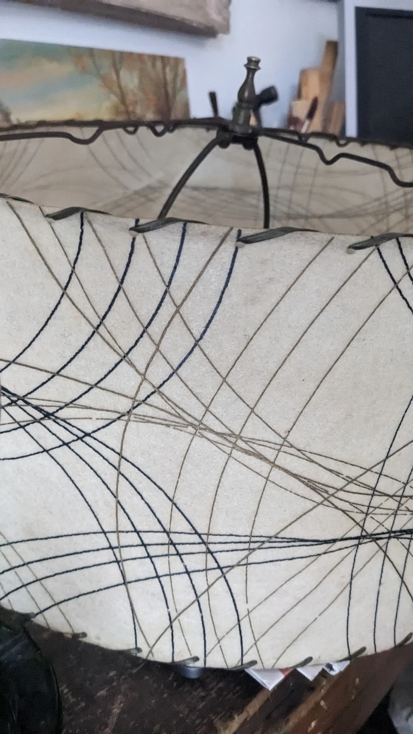 Selling a vintage mid-century modern lamp shade. It features a unique design with intersecting lines on a cream-coloured background. Perfect for adding a retro touch to your home decor!
