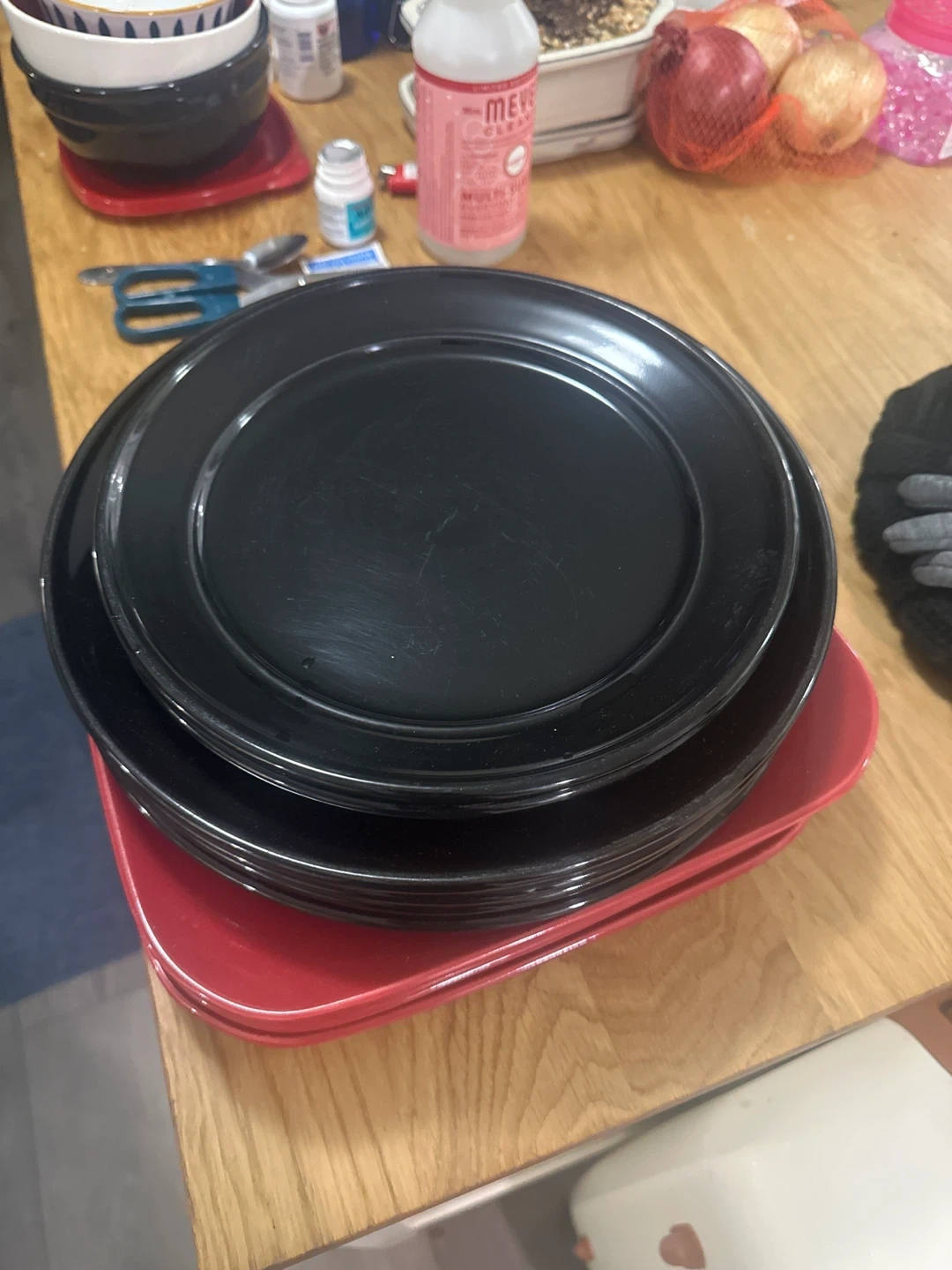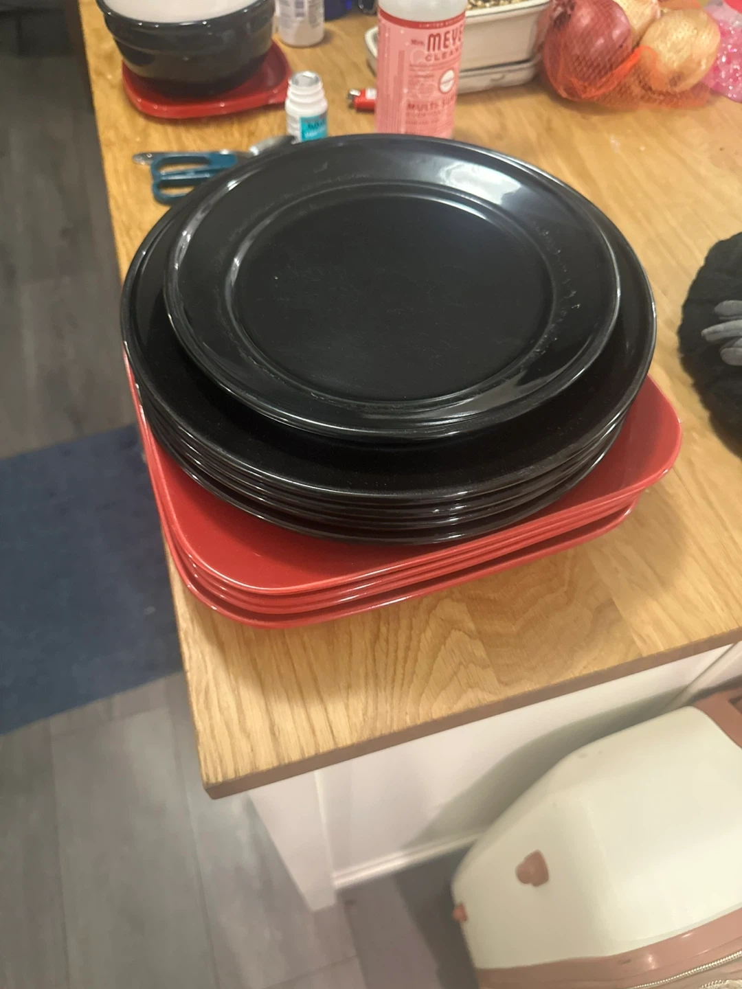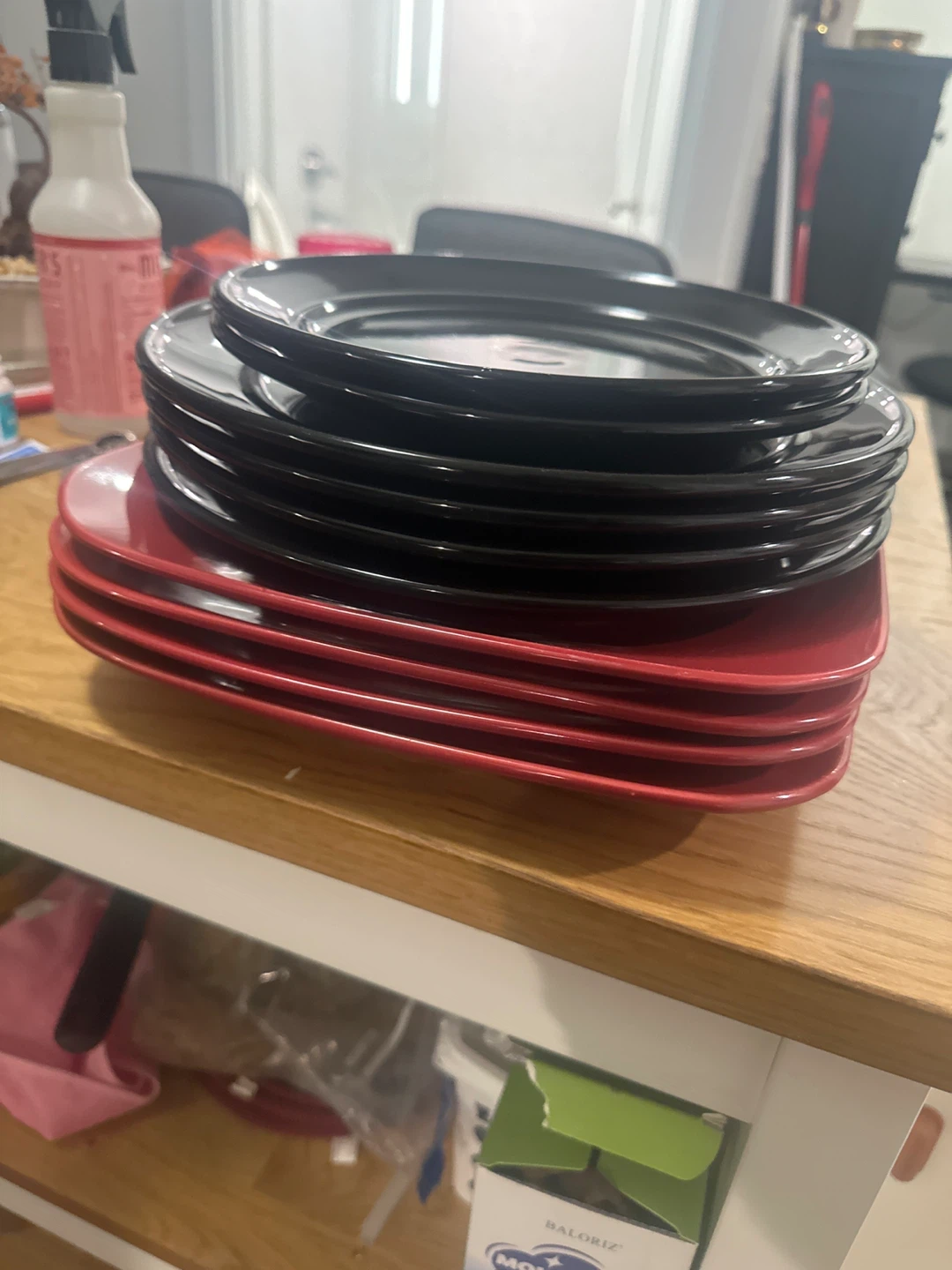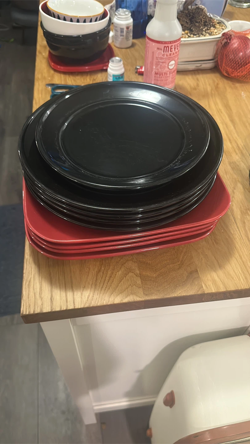 Giving away a set of plates in black and red colours. They are in great shape and ready for your next dinner party! Perfect for adding a pop of colour to your table setting