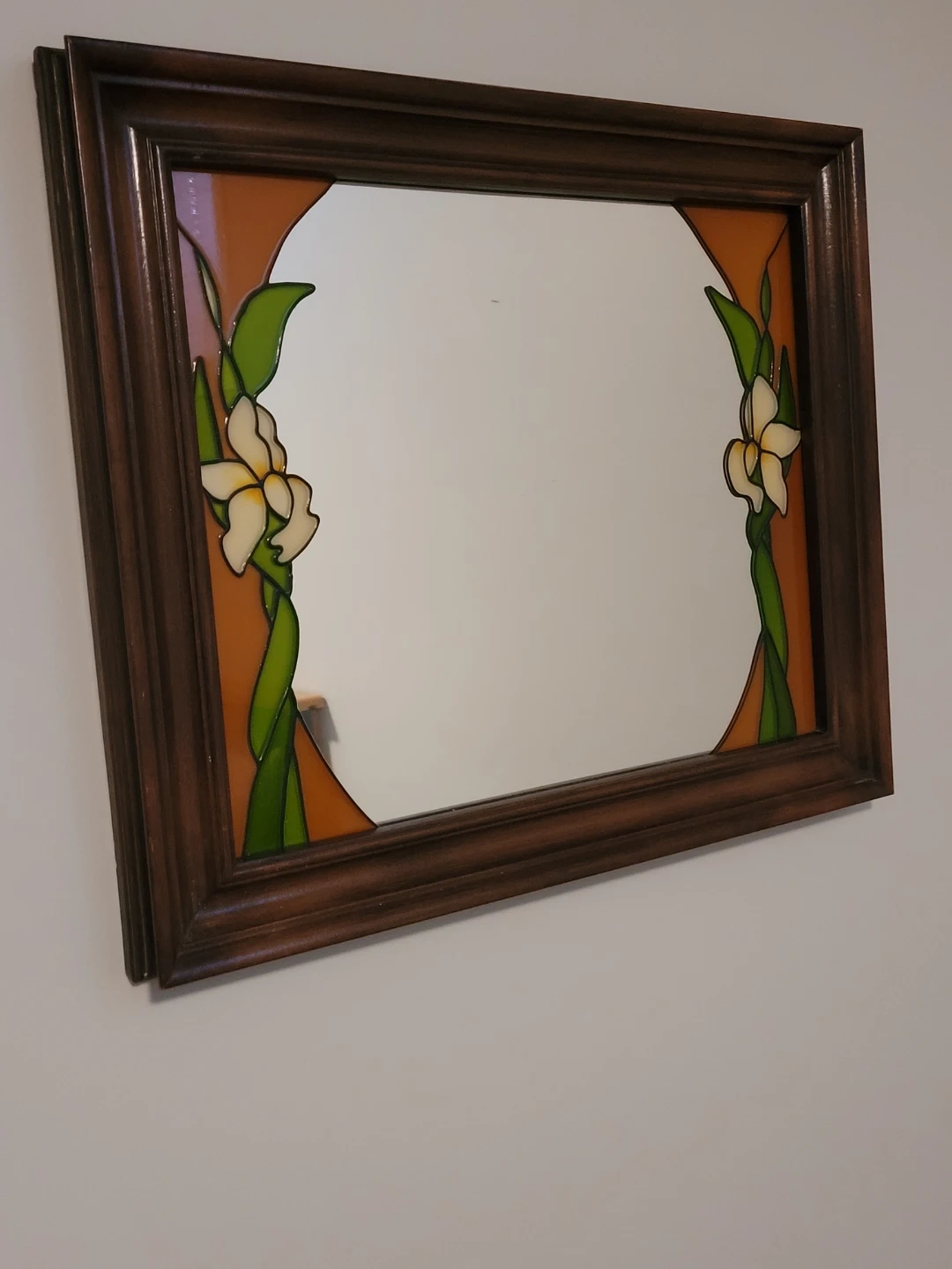 Beautiful mirror with a dark wood frame and floral stained glass accents. It's in great shape and ready to brighten up any room in your home