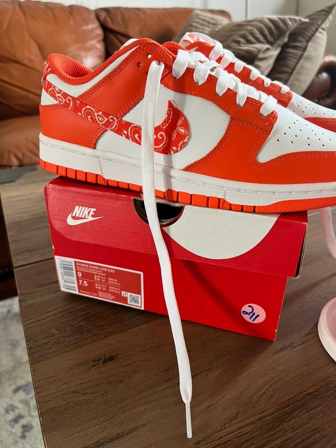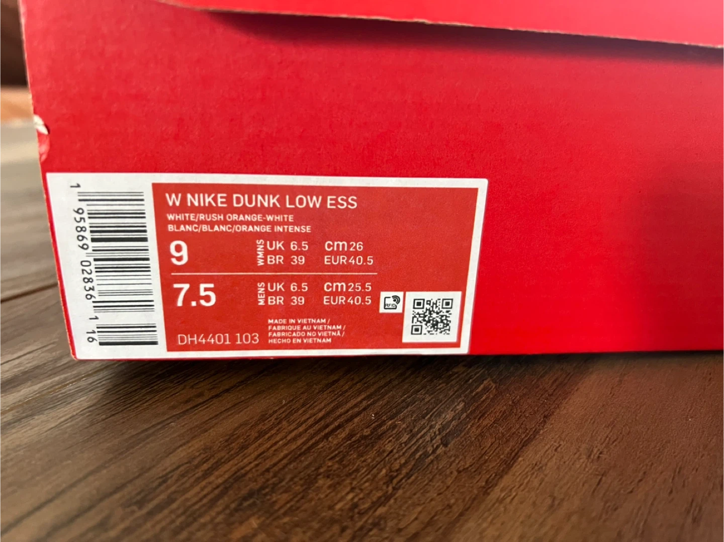 Selling a pair of Nike Dunk Low ESS sneakers in white and rush orange. These are a size 9 (US Women's). Comes with the original box!