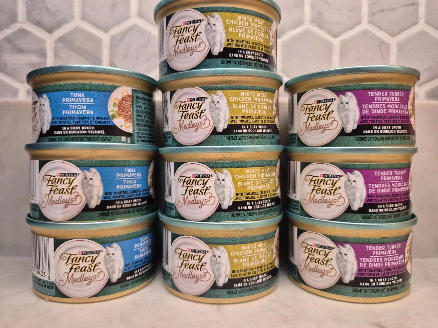 Here's a variety pack of Purina Fancy Feast Medleys gourmet cat food! Each can is in a silky broth, and includes tomatoes, carrots and spinach. Flavours include tuna, white meat chicken, and tender turkey. Best before October 2026, so your kitty can enjoy a fresh and delicious meal!