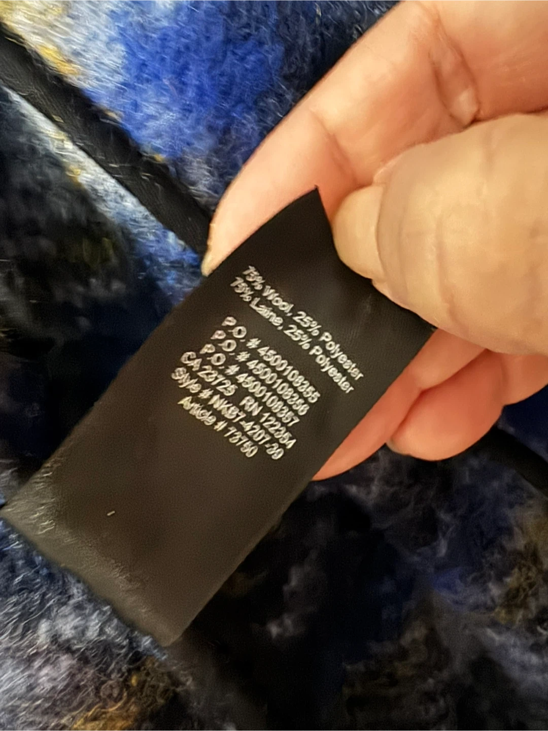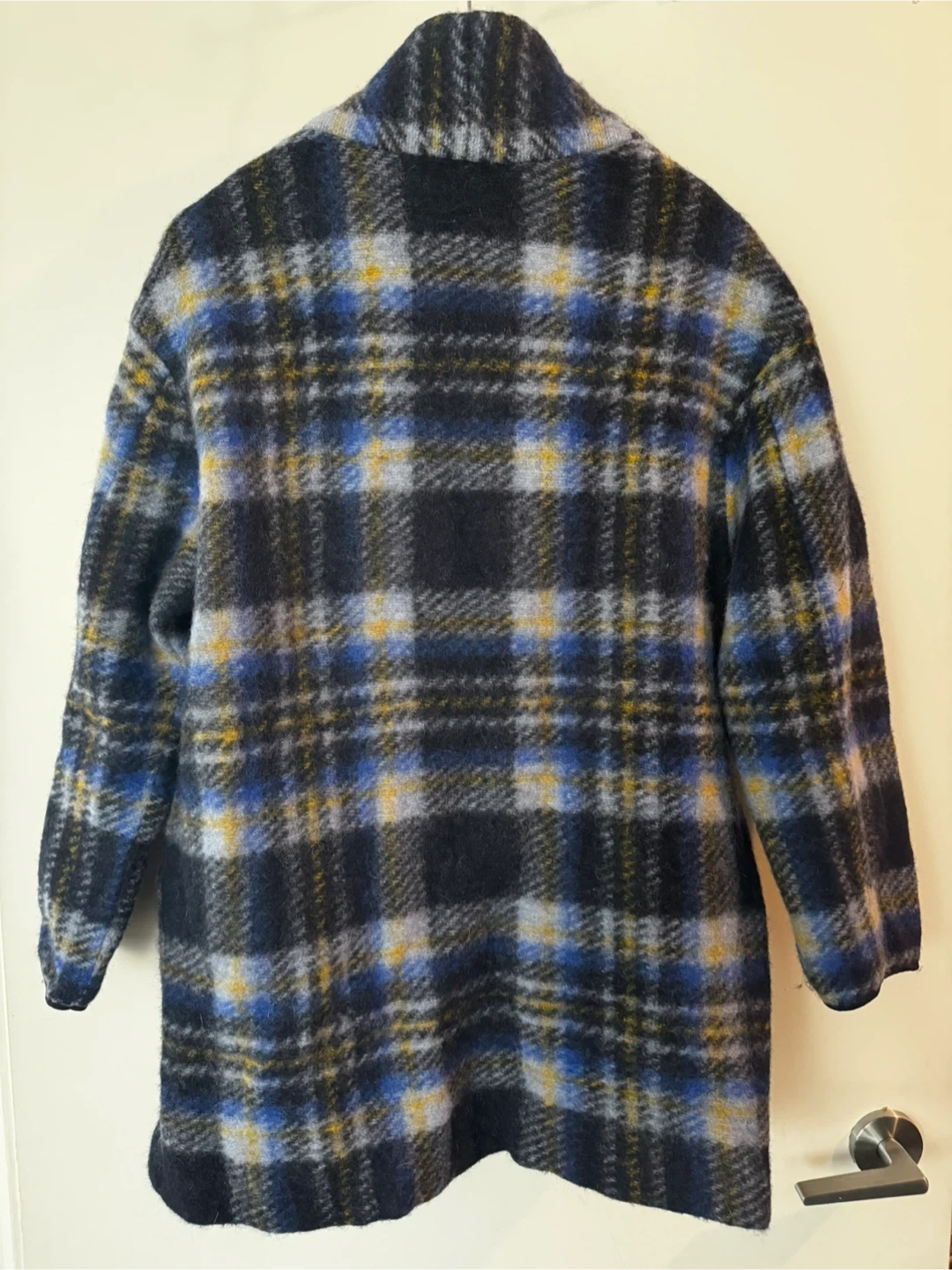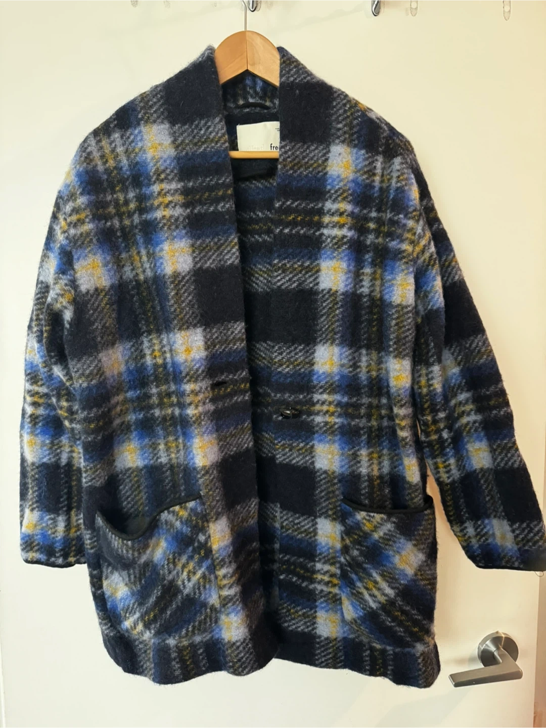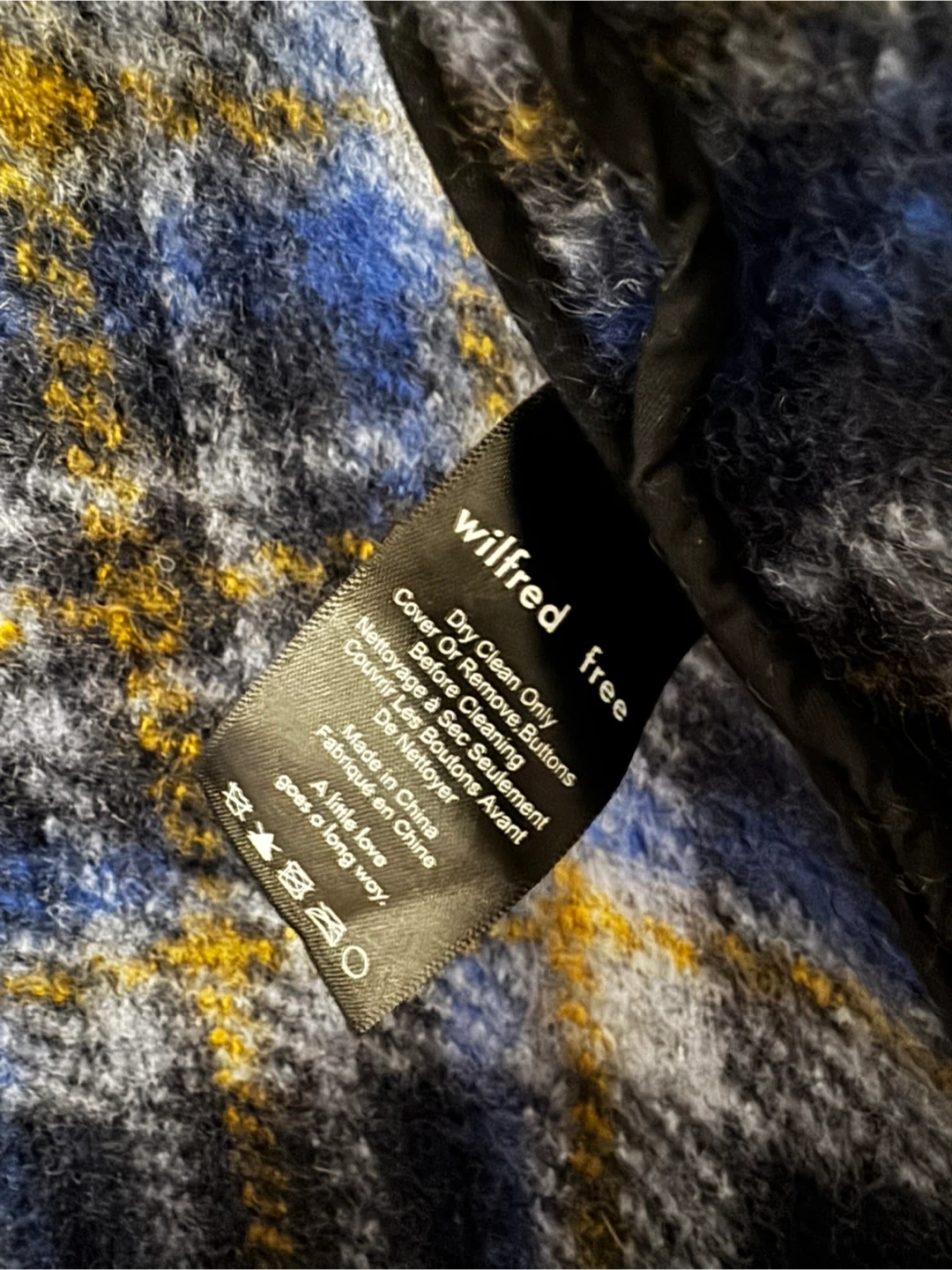 Cozy up in this Wilfred Free coat! It's a size large and features a plaid pattern in blues and yellows.