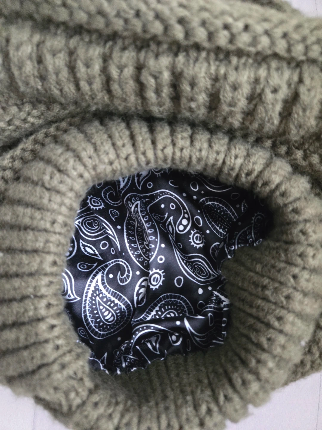 Cozy olive green knit beanie, perfect for keeping warm! It features a stylish knit pattern and a comfortable fit. Inside is a black and white patterned lining