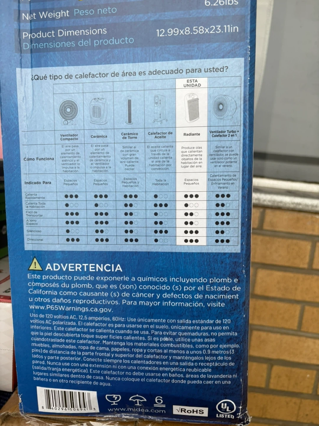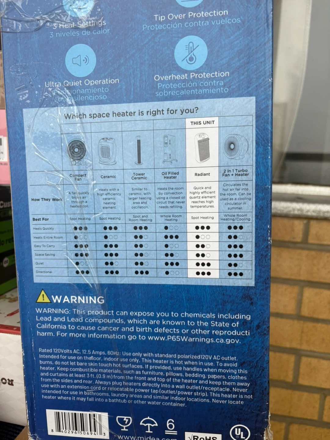 Selling a Midea Infrared Quartz Heater Brand new in box.It features an ultra-quiet operation and three heat settings with an adjustable thermostat. It also has tip-over and overheat protection for safety. The heater is lightweight, portable and easy to carry from room to room. It is designed for spot and whole room heating. Dimensions are 12.99 x 8.58 x 23.11 inches