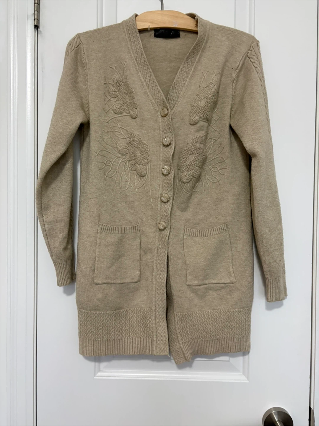 Vintage beige cardigan. Size small. Great condition except for a little bit of pilling that can easily be removed. I am a medium for reference. Pickup near Sherbourne and Adelaide or sometimes at some TTC stations.