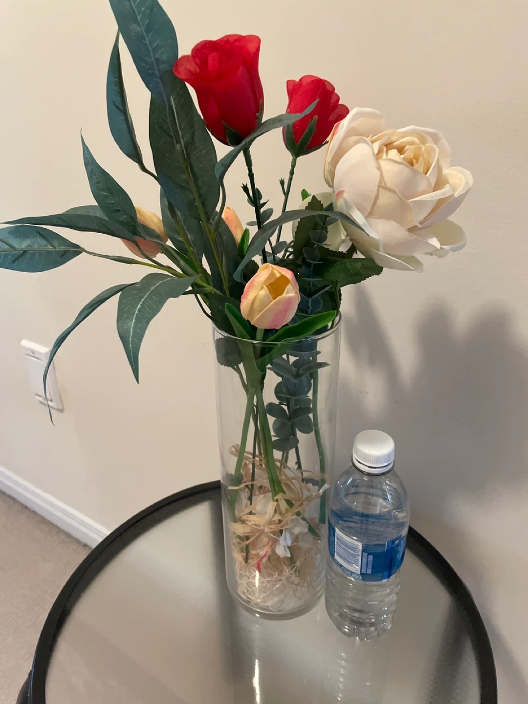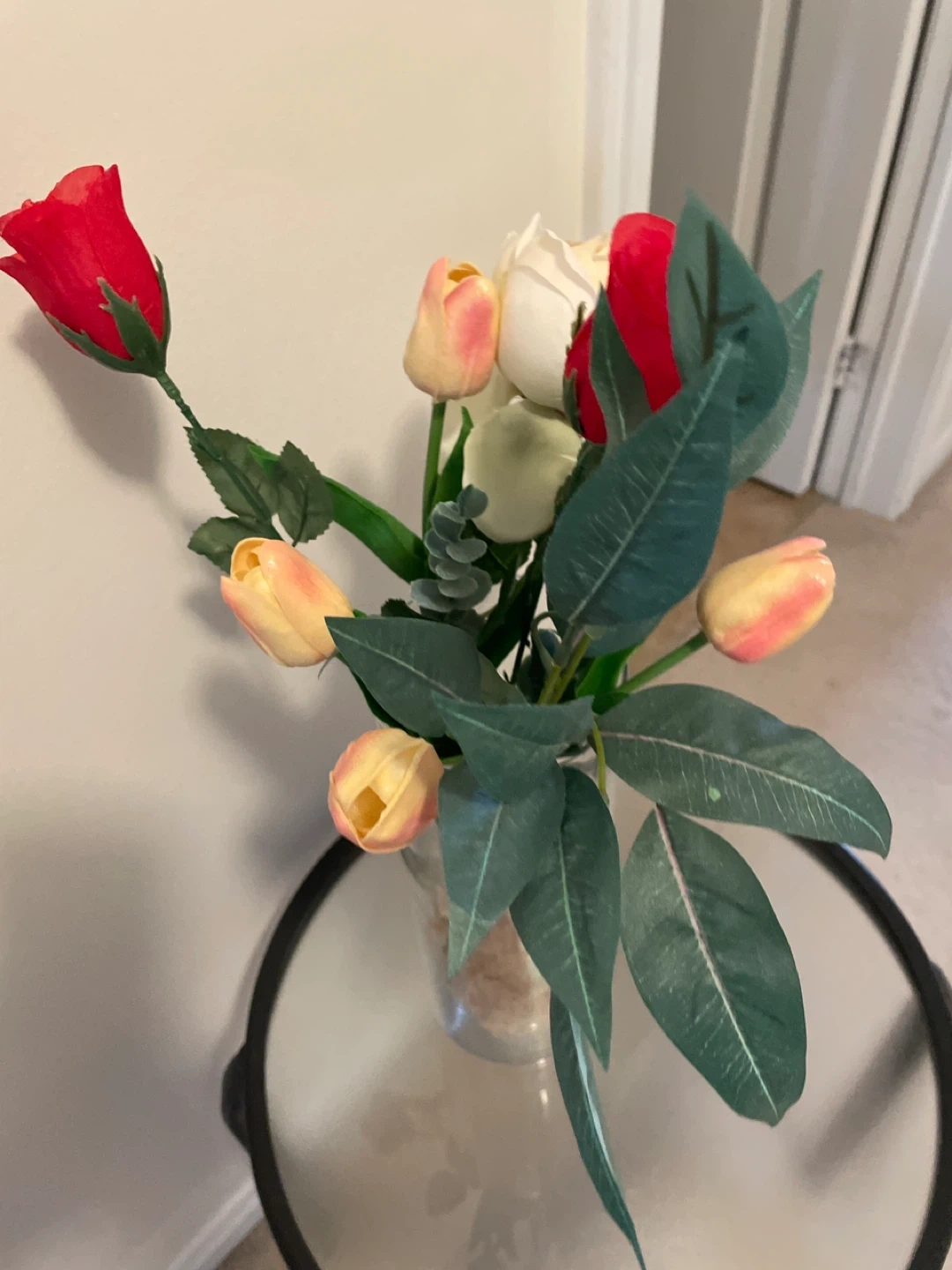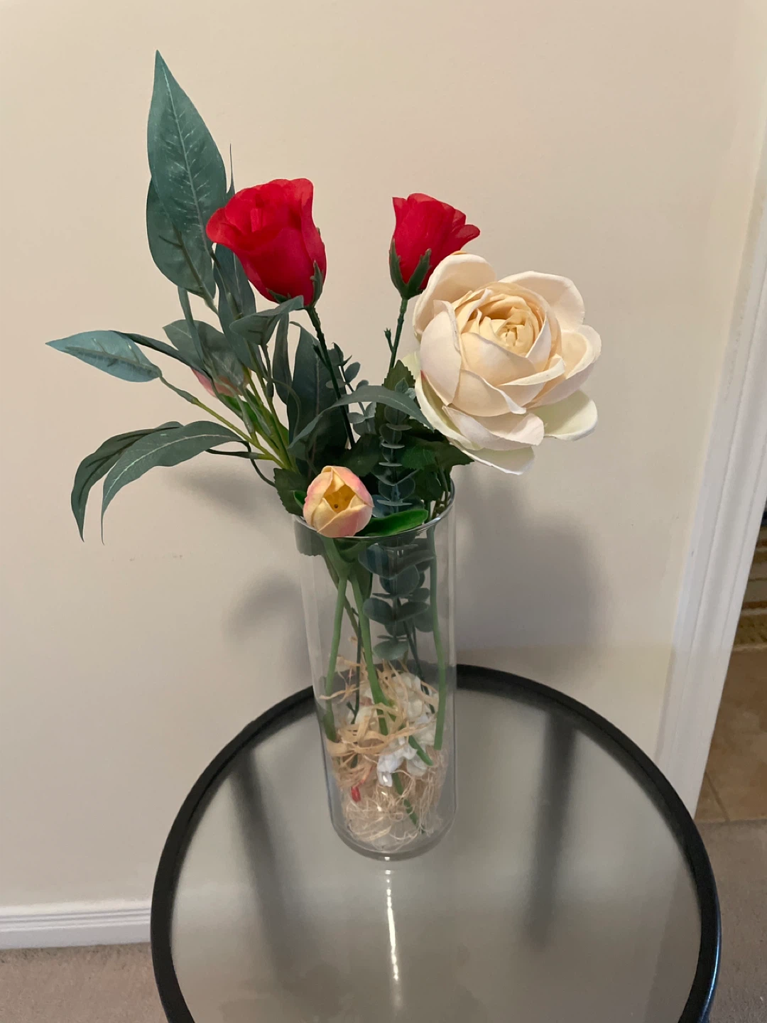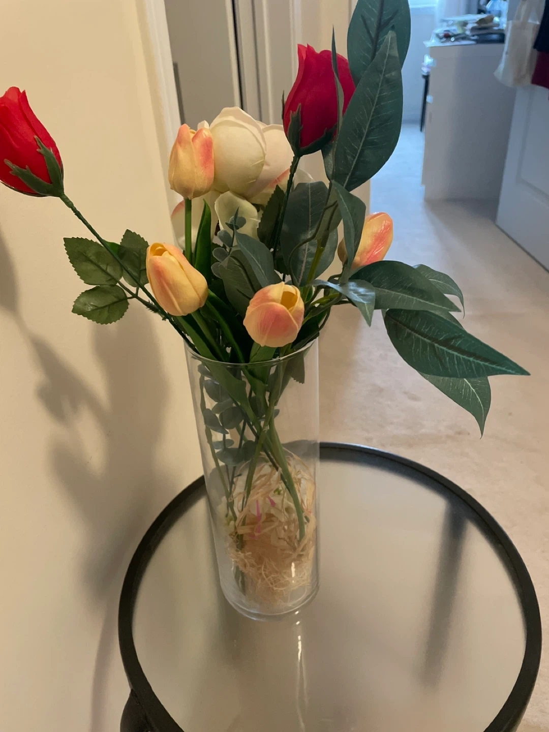 Artificial floral arrangement in a tall glass vase! It features a mix of red roses, tulips, and greenery. Perfect for adding a touch of colour to any room