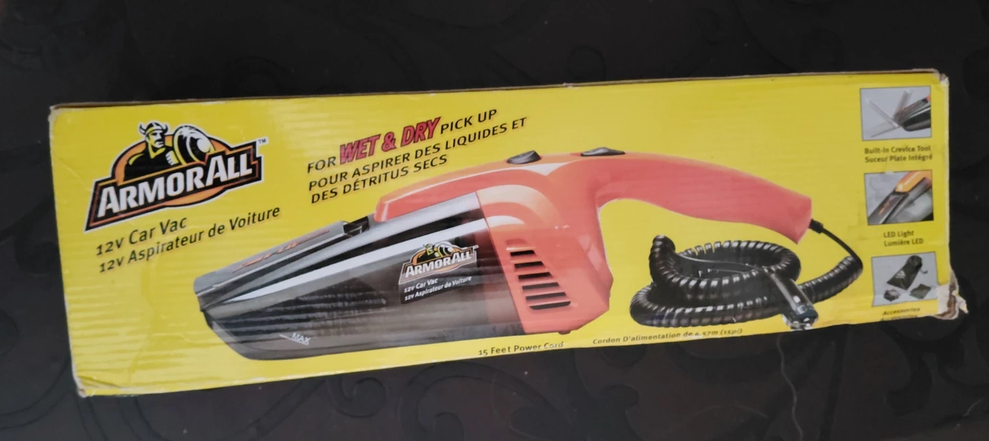 ArmorAll 12V Car Vac, perfect for both wet and dry messes! It comes with a built-in crevice tool and LED light for those hard-to-reach spots. The power cord is 15 feet long, making it easy to reach all areas of your car. It also comes with the box! 🥕