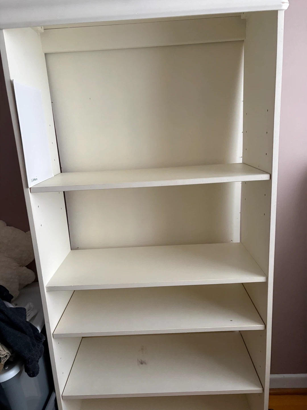 Selling a white bookshelf. It has four shelves and is in good condition. Perfect for storing books, decor, or anything else you need to keep organized