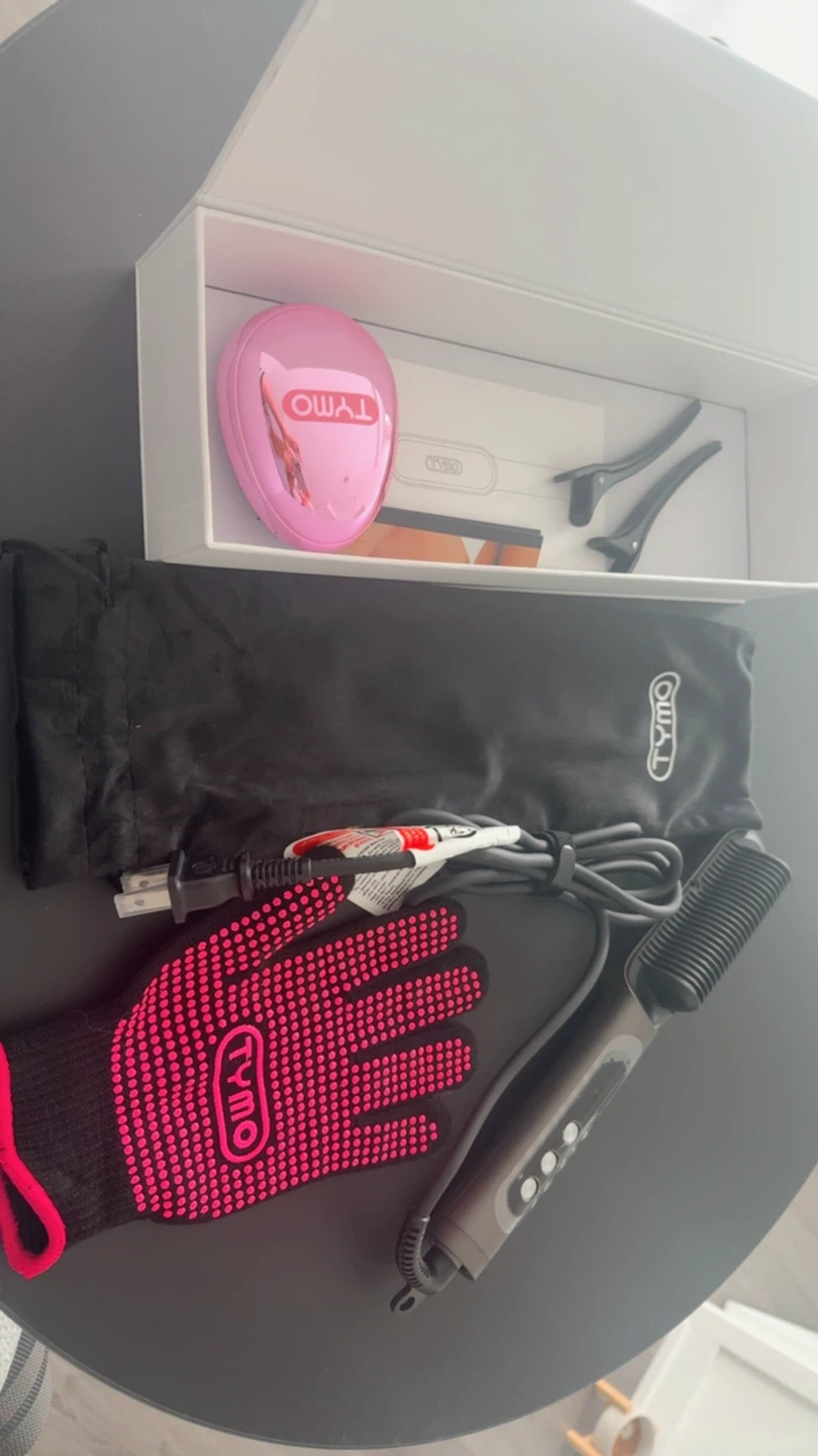 Selling a TYMO hair straightener brush. It comes with the box and all included accessories, such as the heat-resistant glove, hair clips, and carrying pouch. It's in great condition and ready to use!