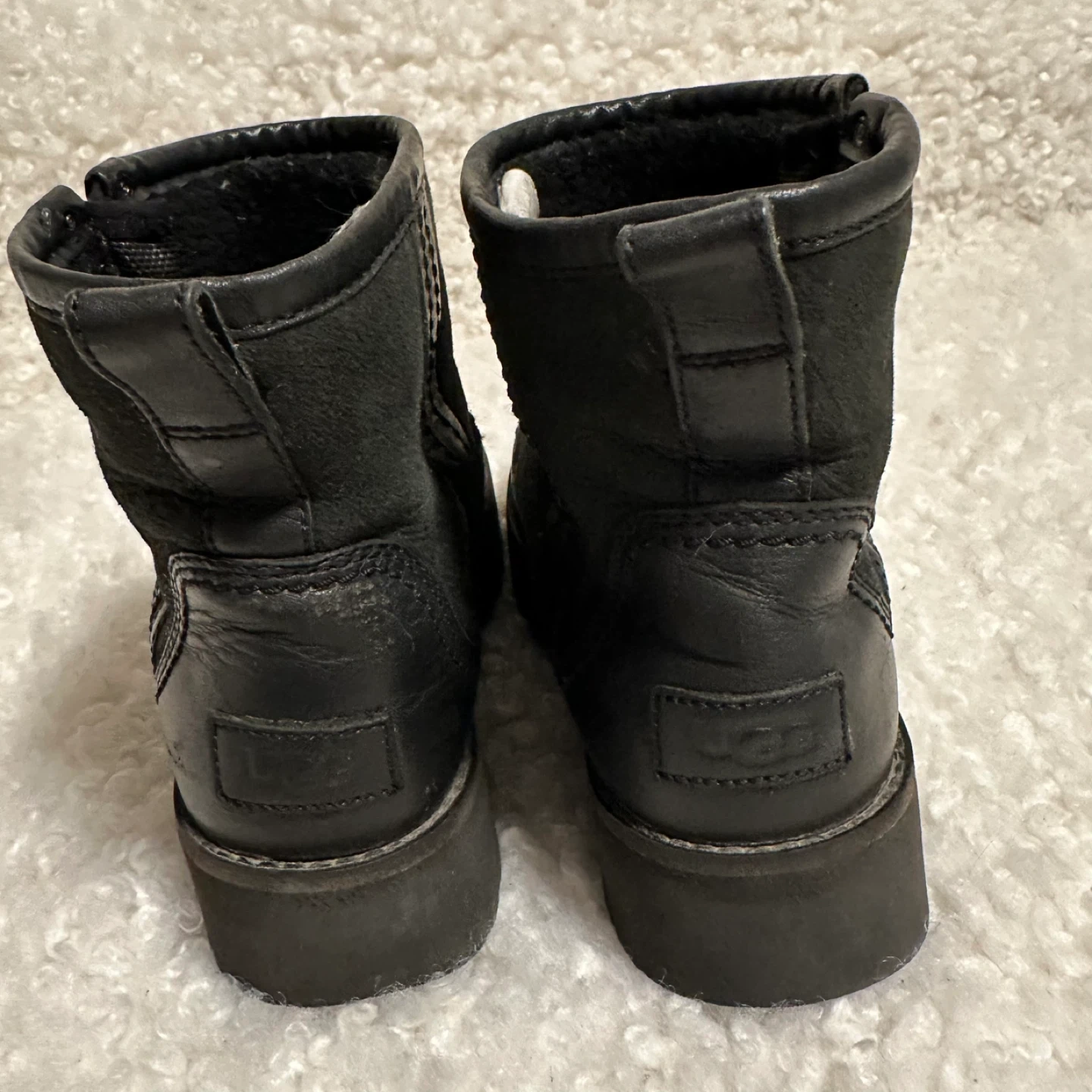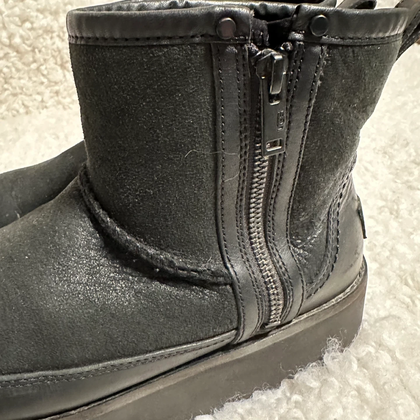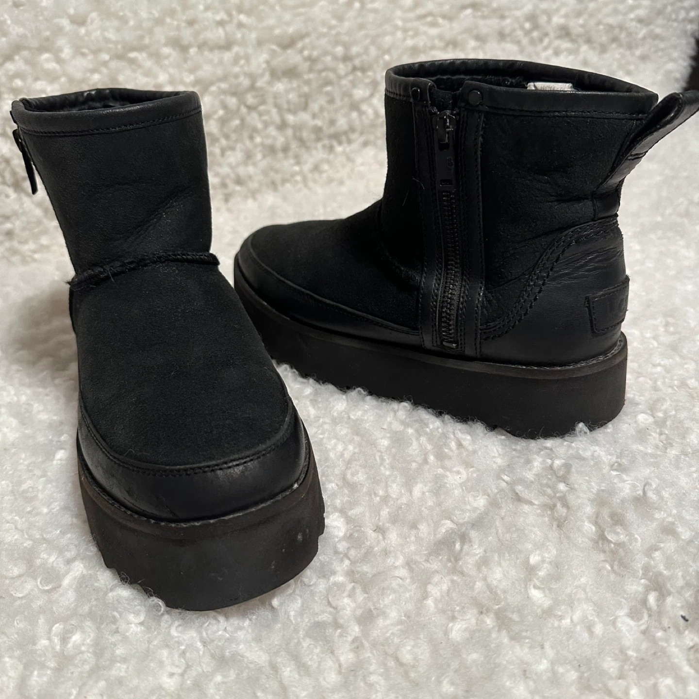 These UGG ankle boots are in great condition and ready for a new owner! They feature a stylish platform sole and a convenient side zipper. The boots are made of black leather, making them a versatile addition to any wardrobe