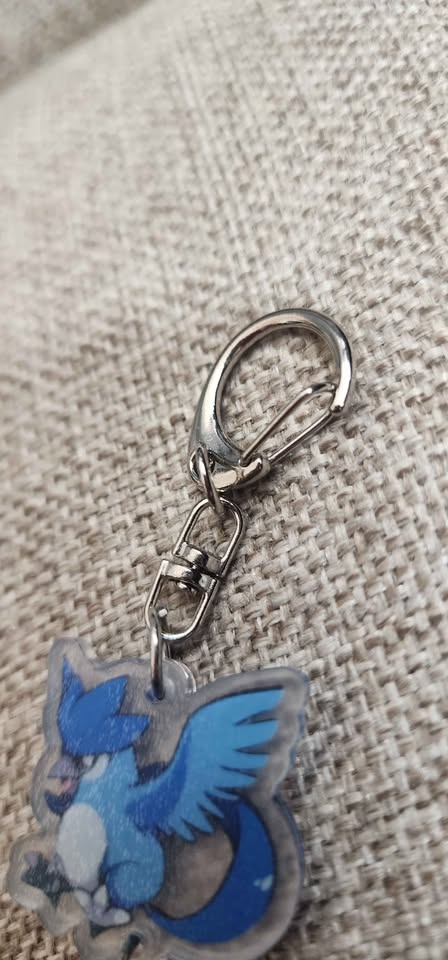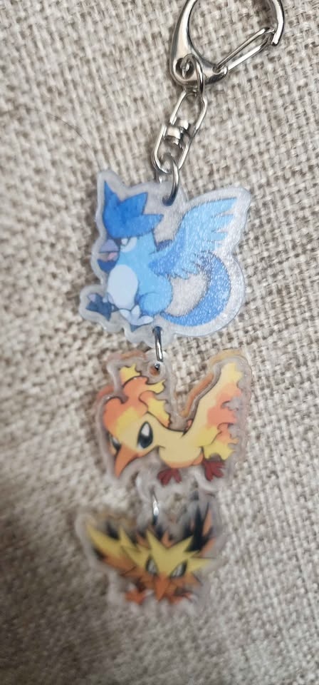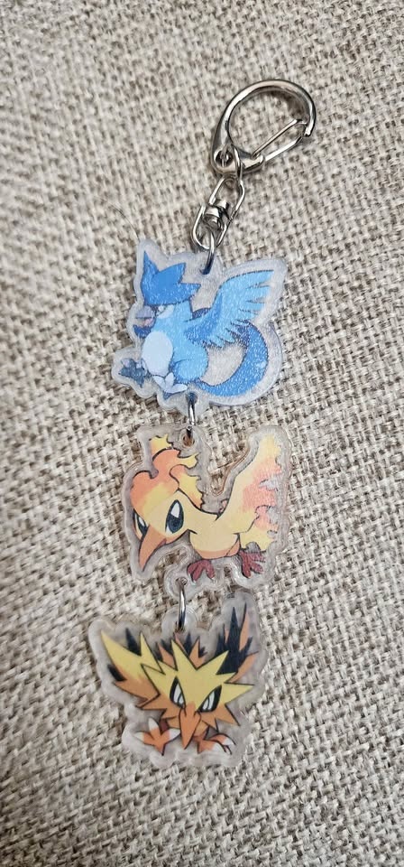 Pokémon keychain featuring the three Legendary Birds of Kanto: Articuno, Zapdos, and Moltres.