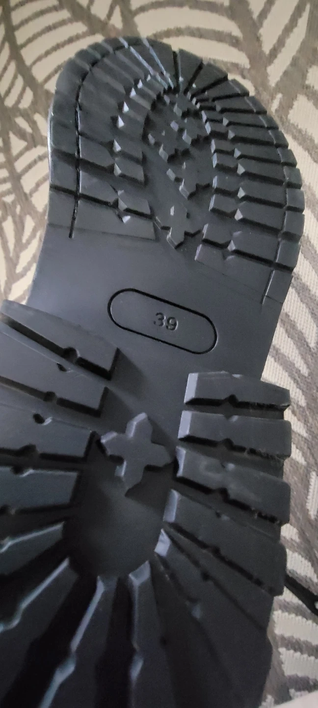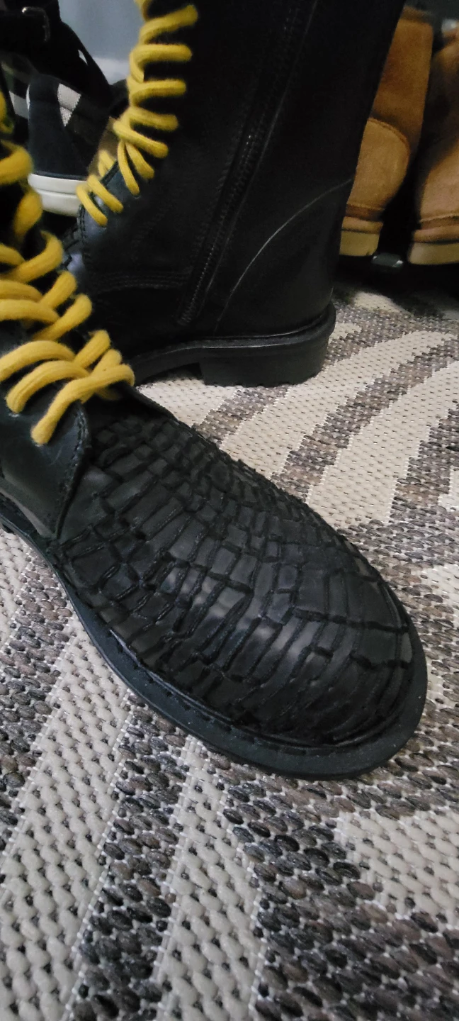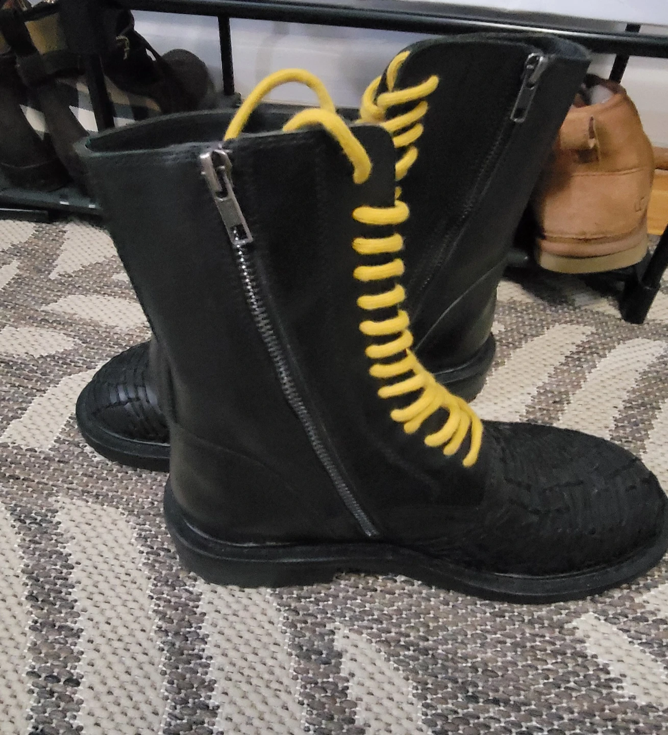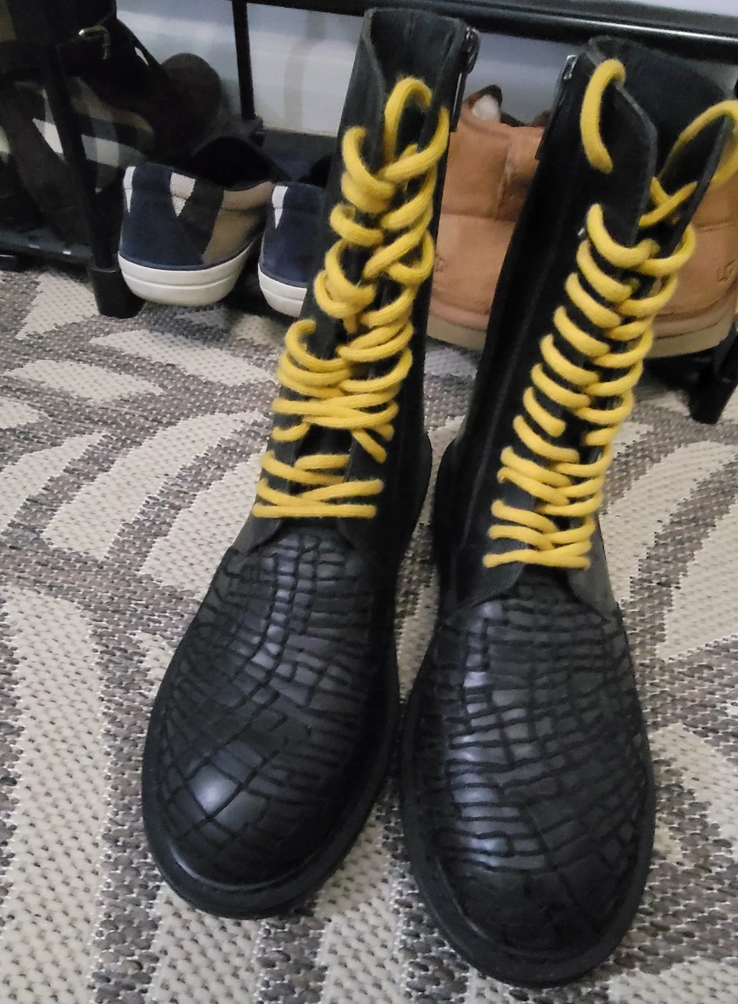 Selling a pair of black leather boots. The size is 39 (European). They feature a unique textured design and bright yellow laces!