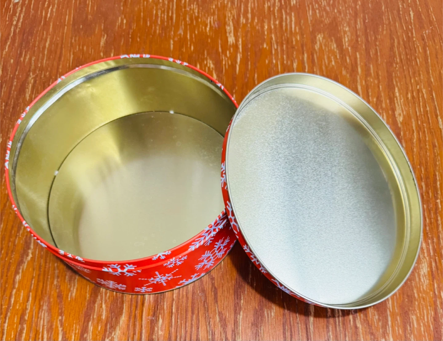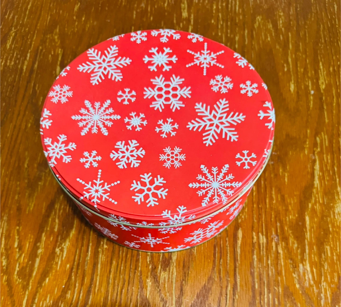 Selling a red tin container with a snowflake design. It's perfect for storing cookies or other treats during the holiday season. The tin is in good condition and ready for a new home