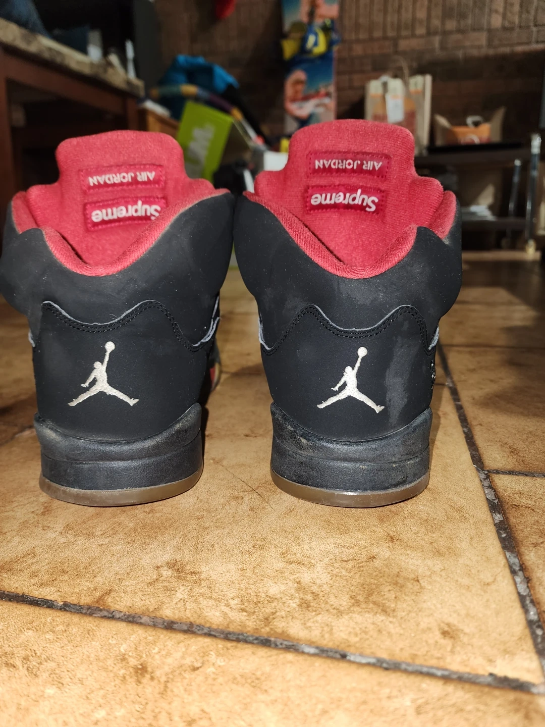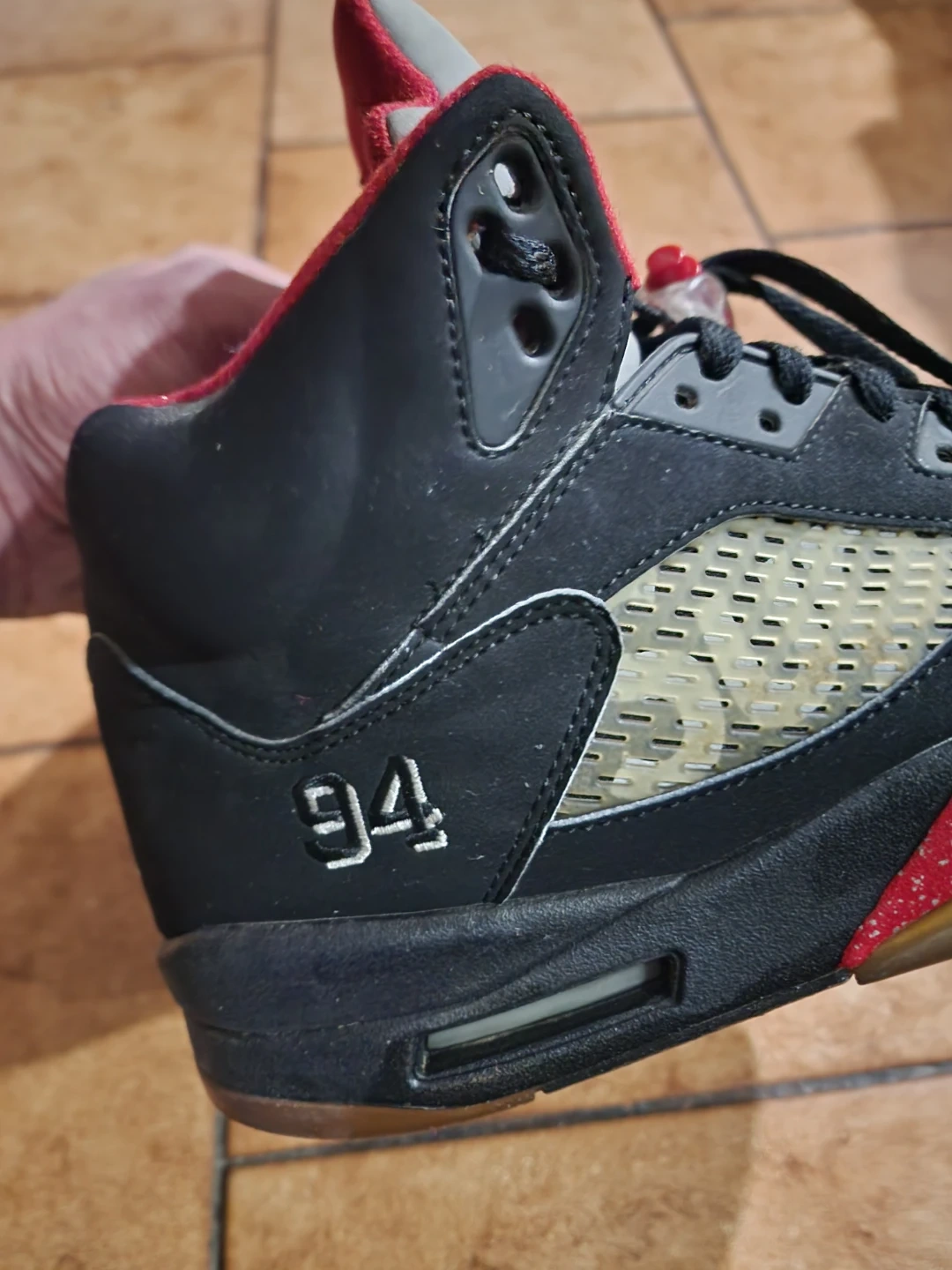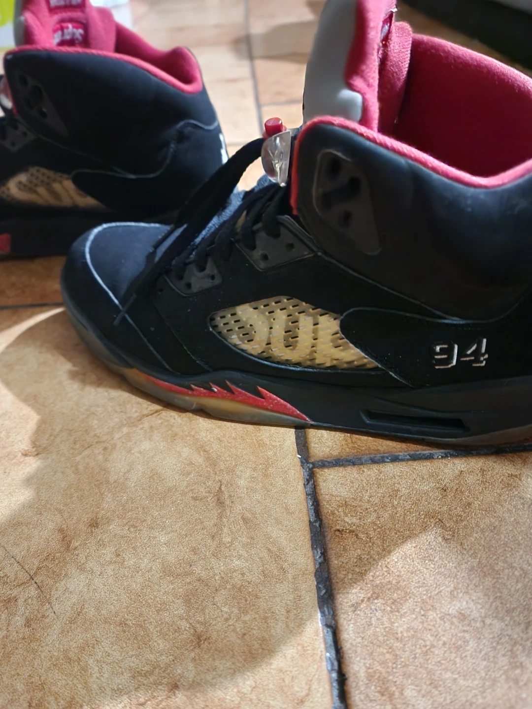Selling a pair of Air Jordan 5 Retro Supreme in black. They show some signs of wear, but overall they're in good condition. These have the number '94' stitched on the side. A unique addition to any sneaker collection!