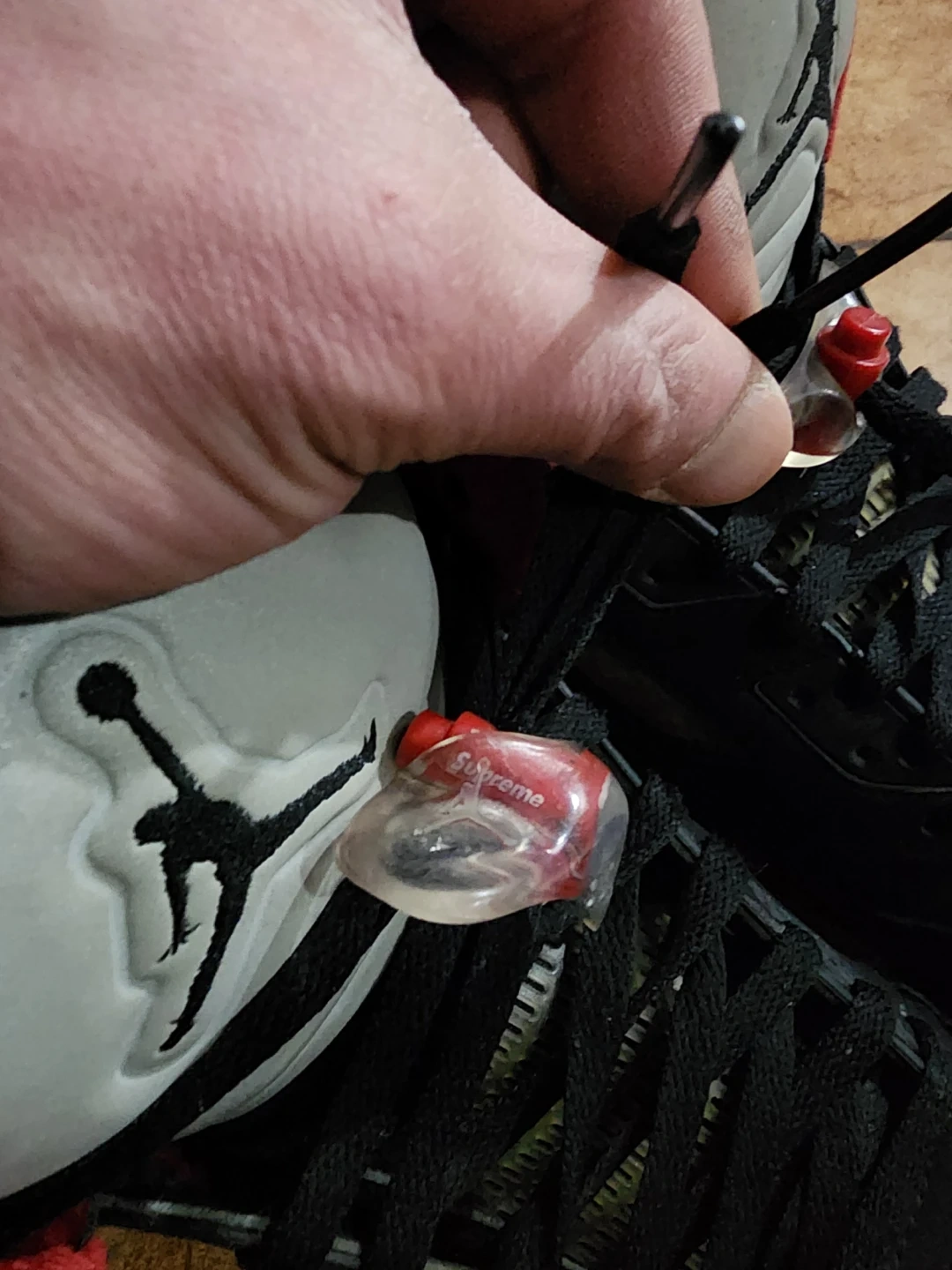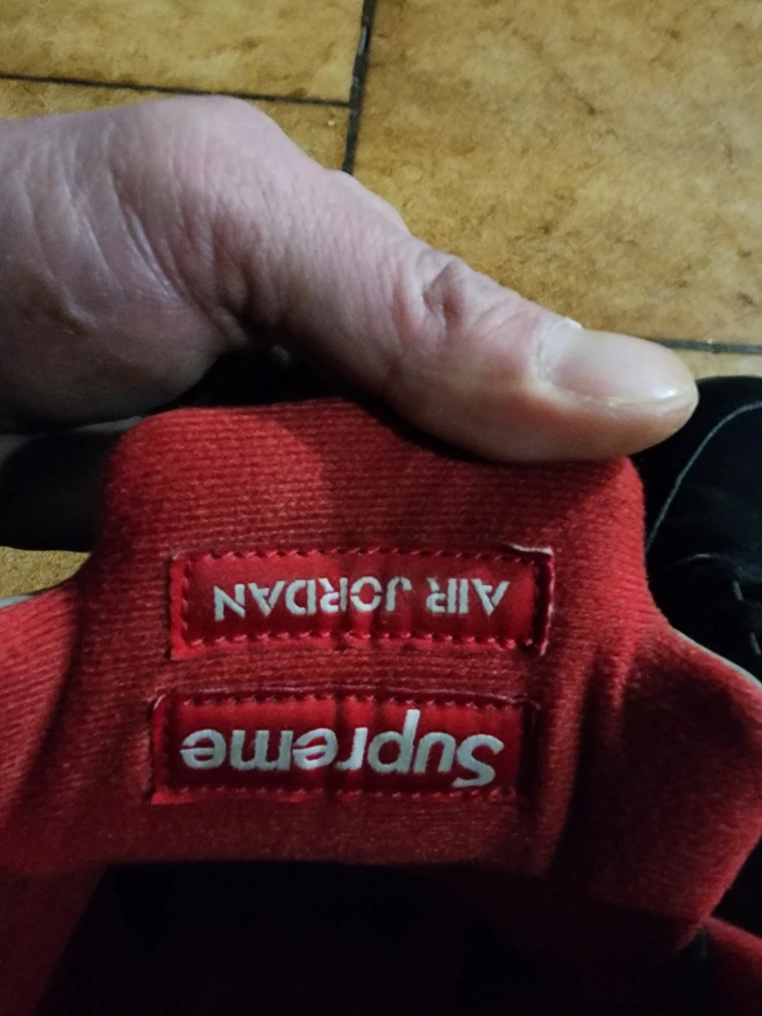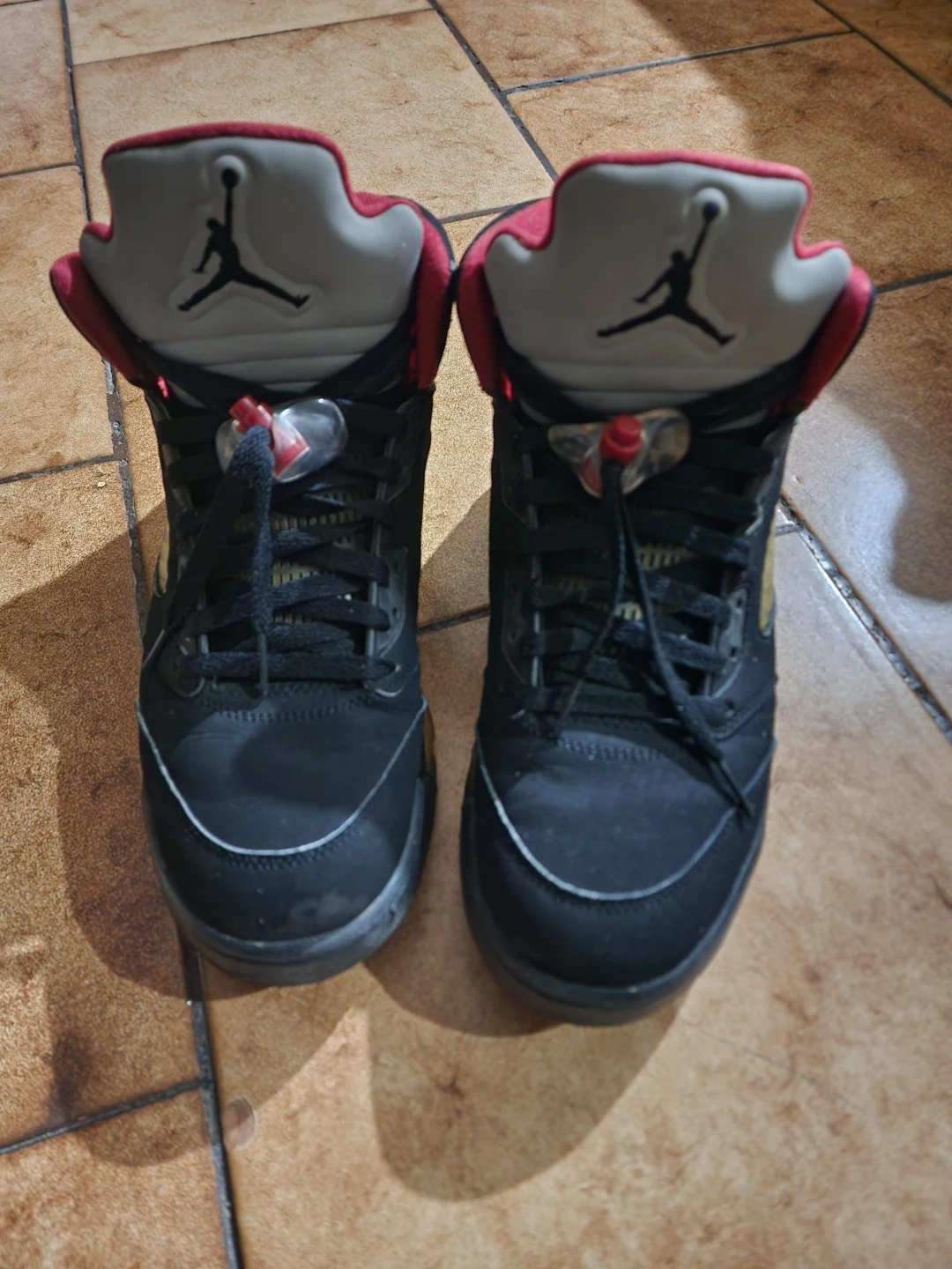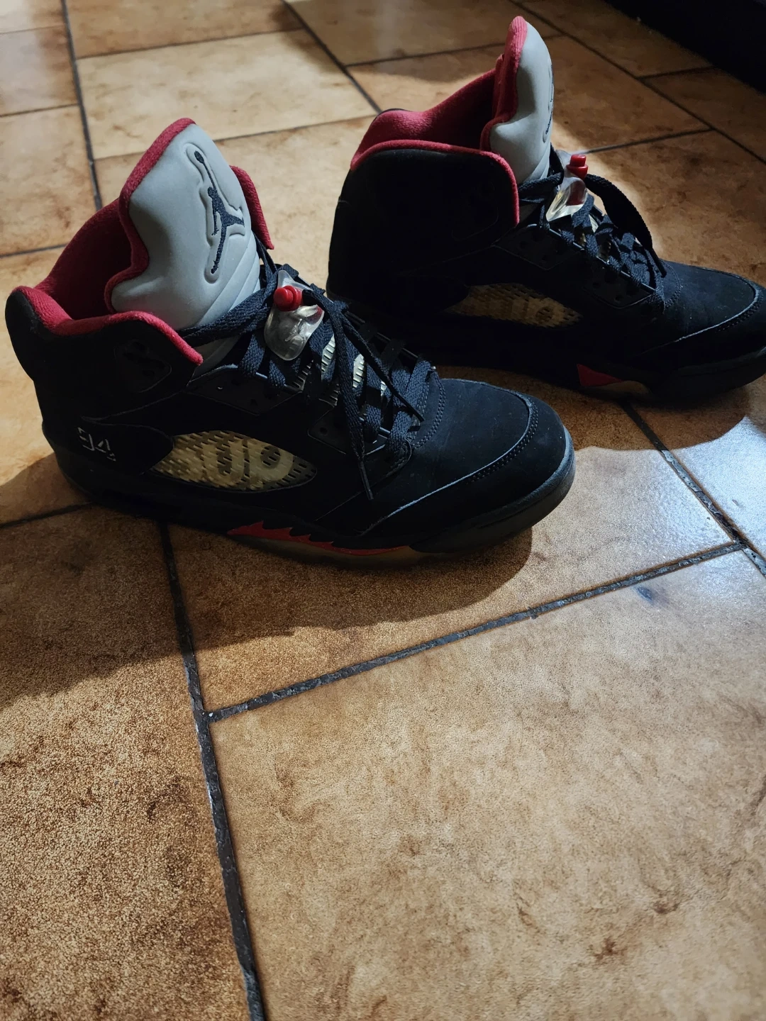 Selling a pair of Air Jordan 5 Retro Supreme in black. They show some signs of wear, but overall they're in good condition. These have the number '94' stitched on the side. A unique addition to any sneaker collection!