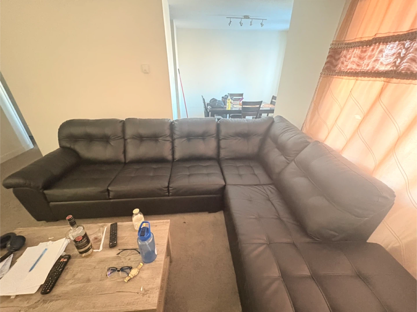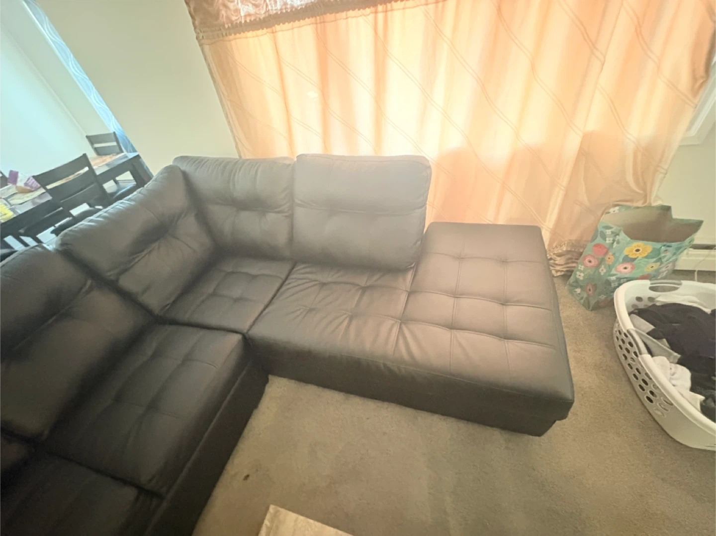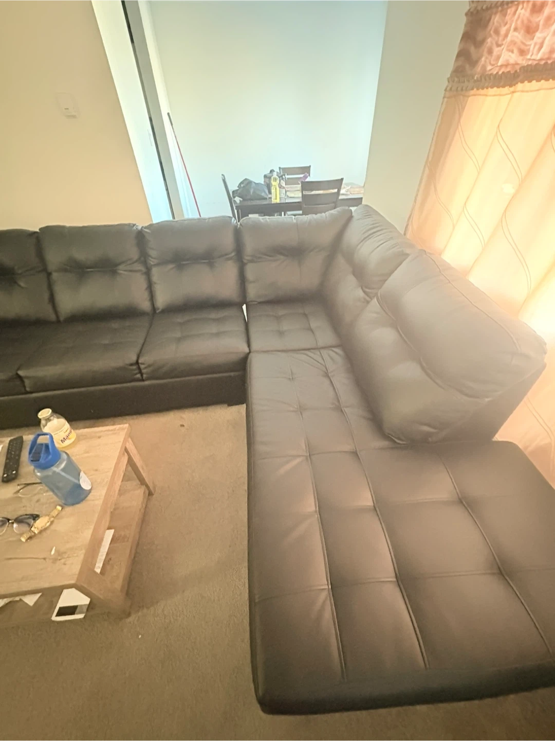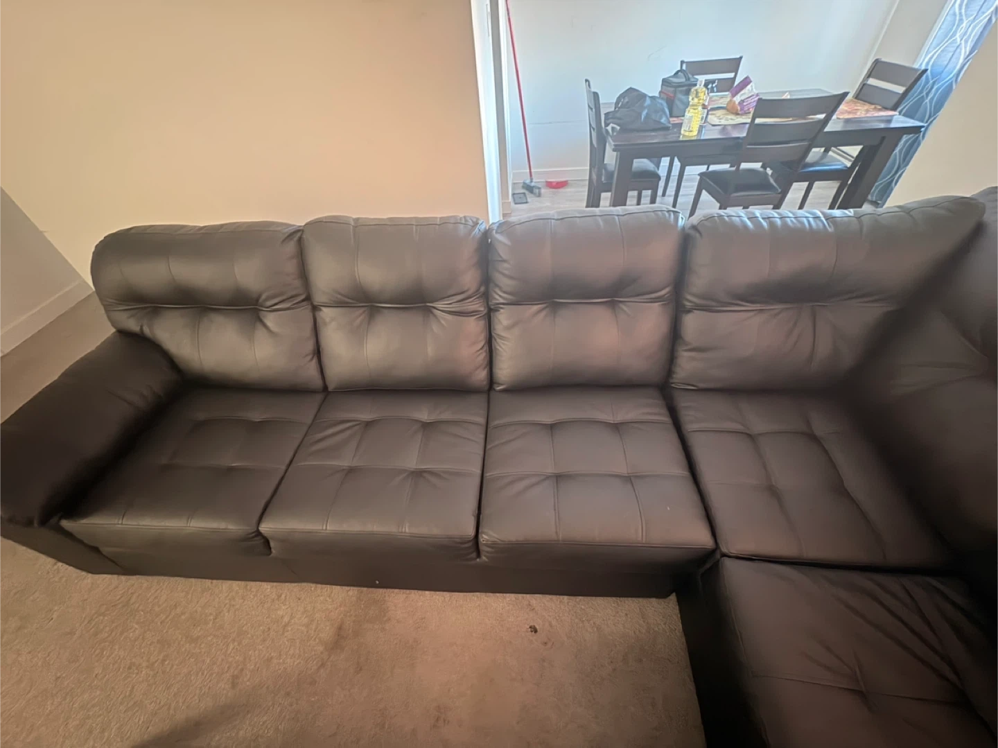 Selling a black leather sectional sofa. It's in good condition and would be a great addition to any living room! It's a comfortable and stylish piece of furniture