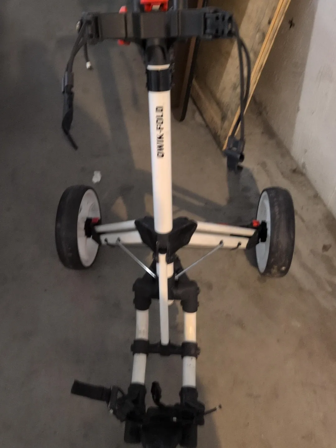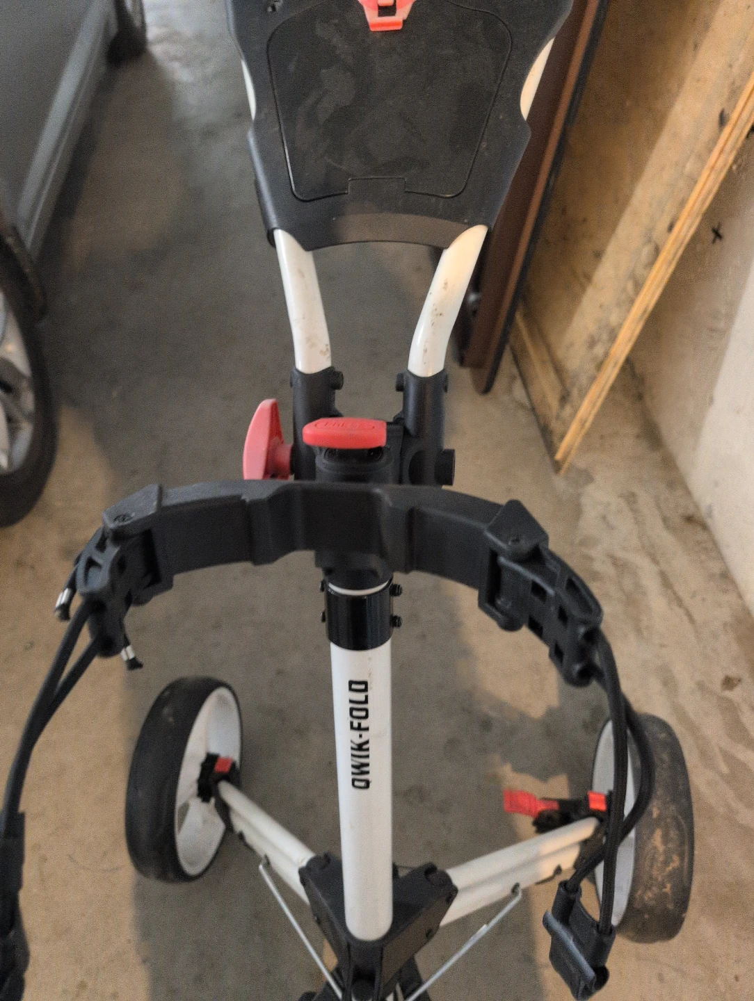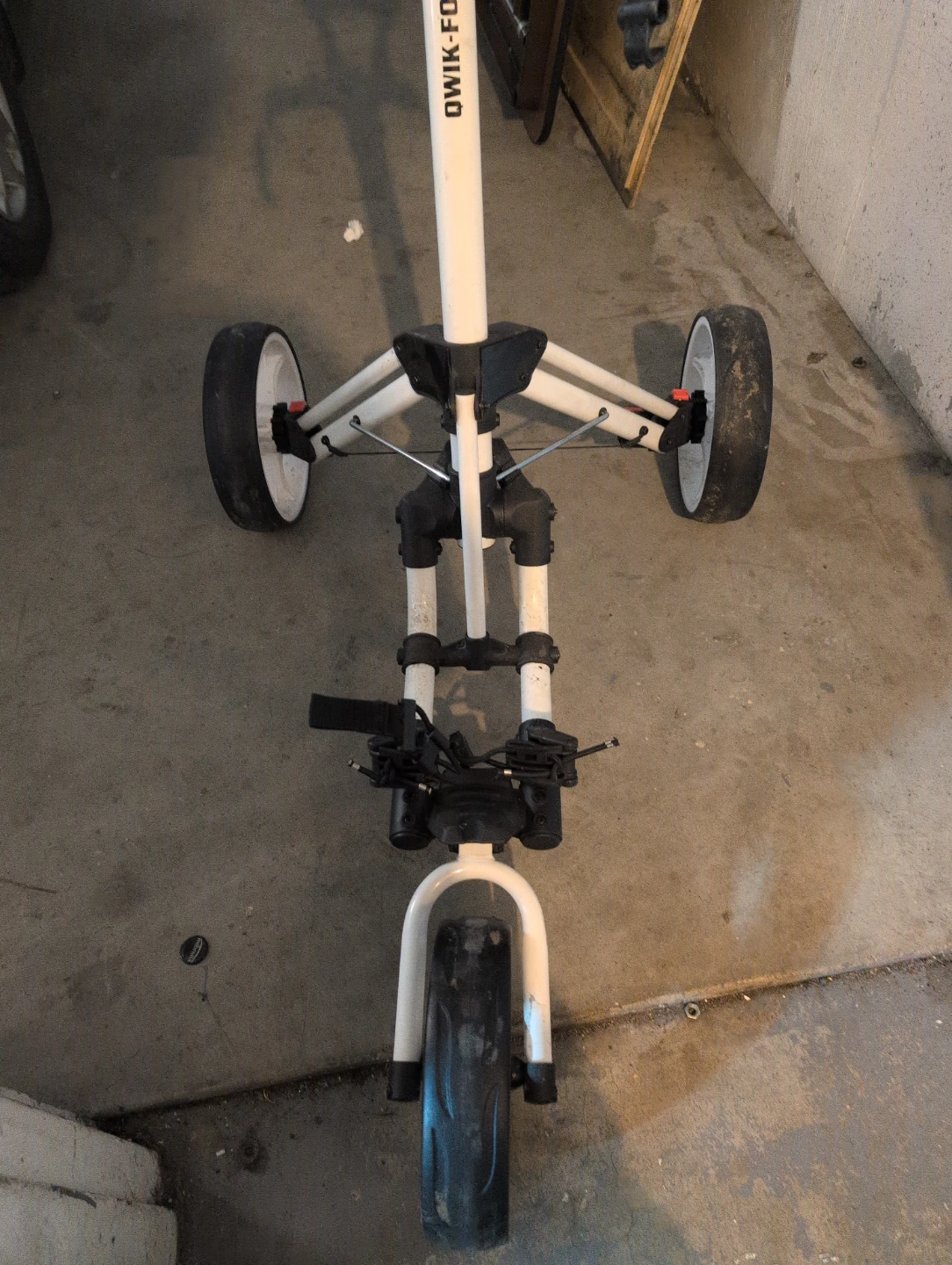 Selling a QWIK-FOLD golf cart in good condition! It's a lightweight and portable cart, perfect for carrying your clubs around the golf course. It's easy to fold and store when not in use.
