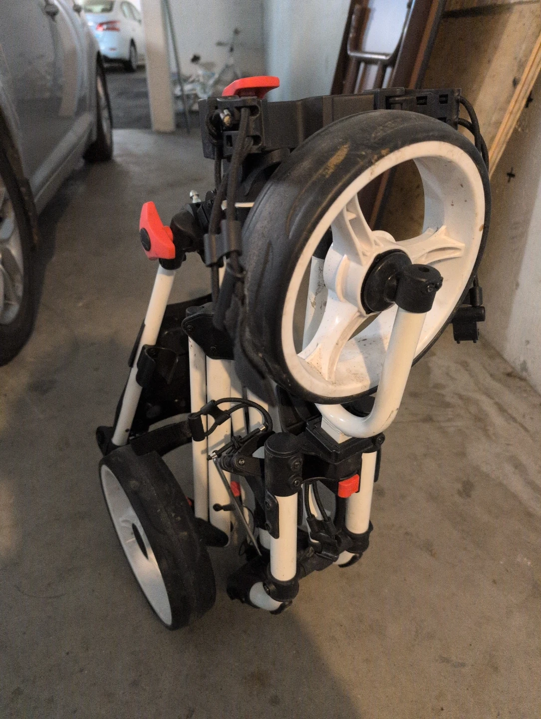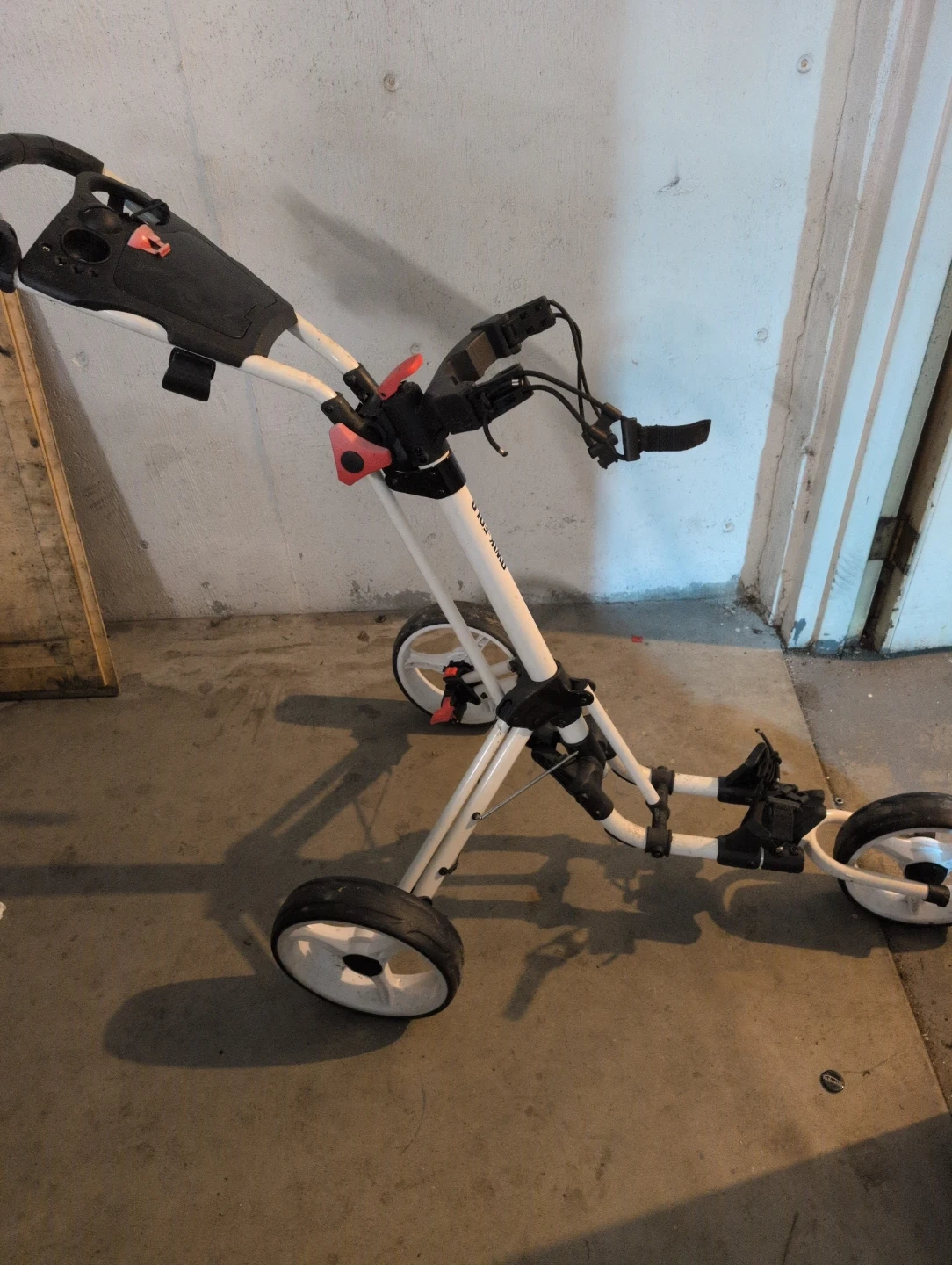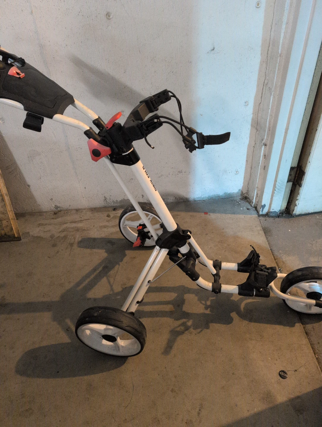 Selling a QWIK-FOLD golf cart in good condition! It's a lightweight and portable cart, perfect for carrying your clubs around the golf course. It's easy to fold and store when not in use.