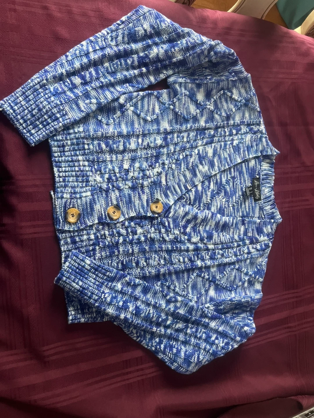 Cozy blue and white knit cardigan from Love & Liberty! Features a button-up front with wooden buttons and a stylish knit pattern. Perfect for layering on those cooler days!