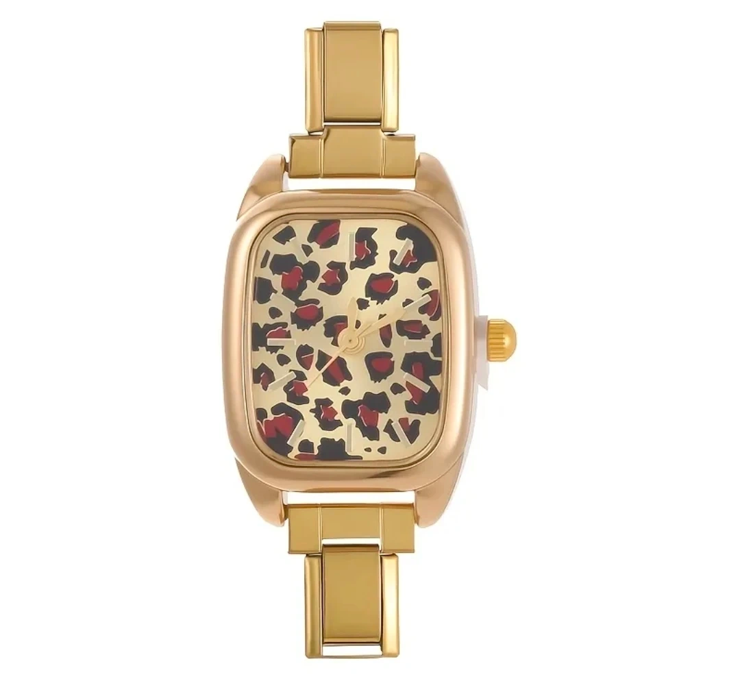 Stylish gold-tone watch with a fun leopard print face! The band and case are a matching gold colour. It's in great condition and ready to accessorize your outfits