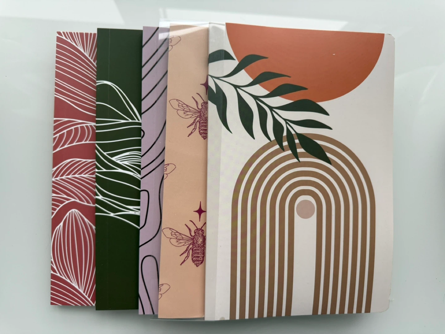 Selling a set of notebooks. They each have 100 pages and measure 6" x 9" (151 mm x 228 mm). They have various designs on the cover