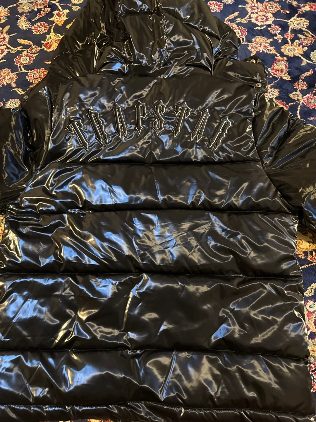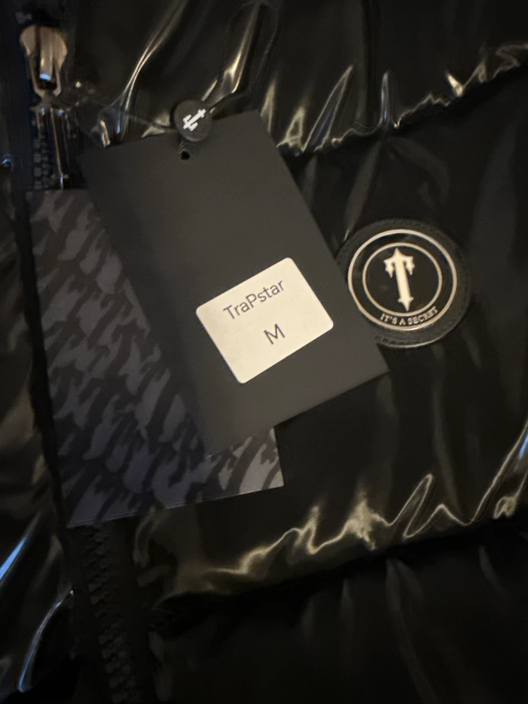 Selling a Trapstar puffer jacket in black, size medium. The outer and filling are both 100% polyester. Great for staying warm and stylish!