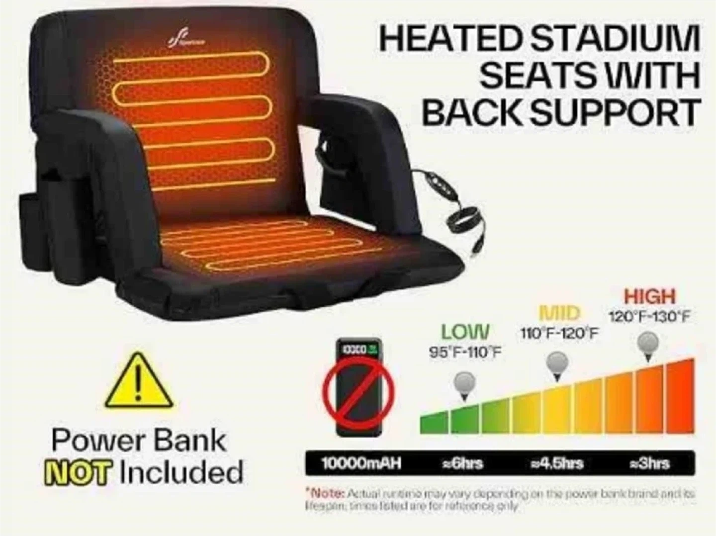 Stay warm and comfy at the game with this Sportneer heated stadium seat! It's got great back support and three heat settings: Low (95°F-110°F), Mid (110°F-120°F), and High (120°F-130°F). Please note that the power bank is not included.