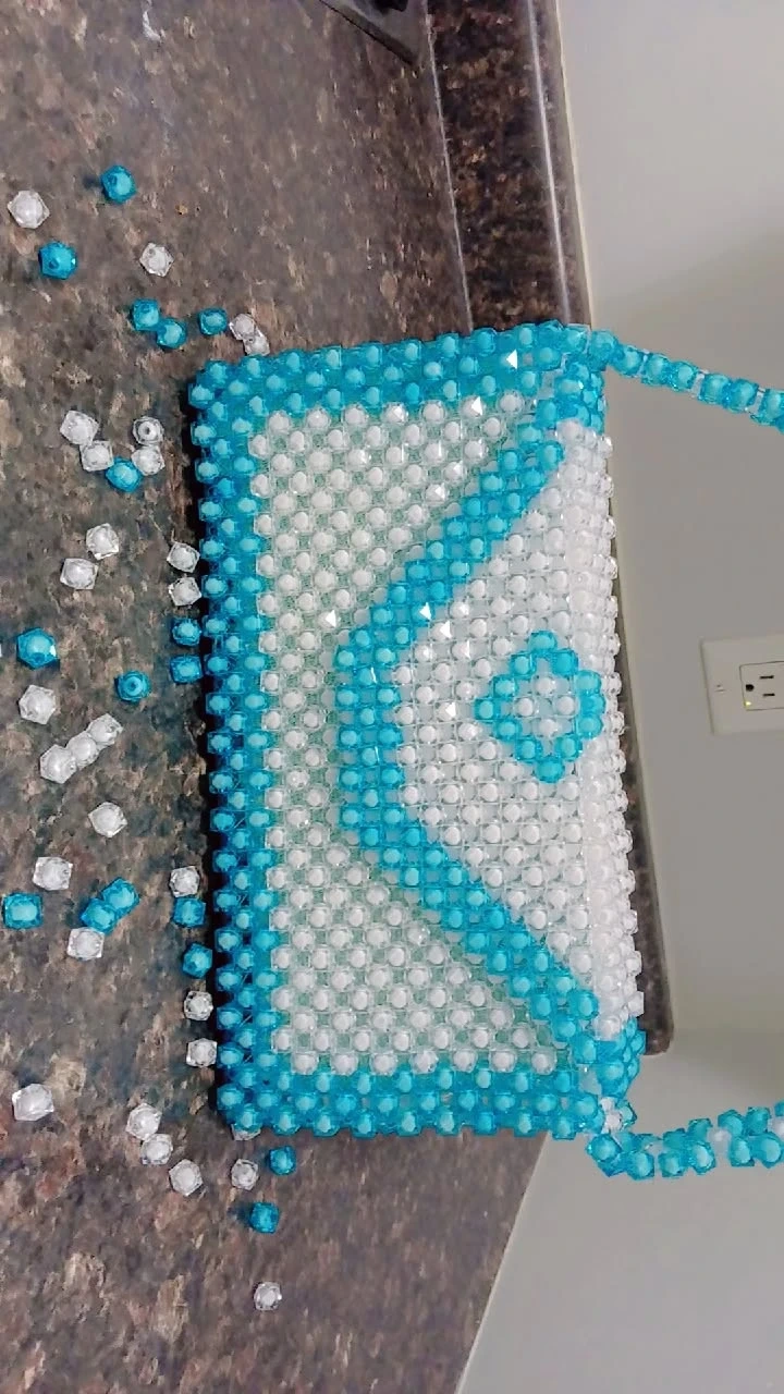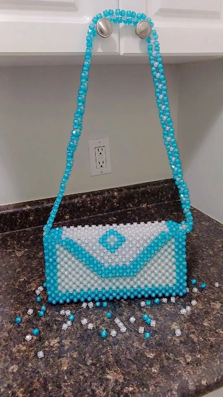 Check out this unique handmade beaded purse! It features a lovely combination of blue and white beads, creating a stylish and eye-catching design. Perfect for adding a touch of handmade charm to your outfit